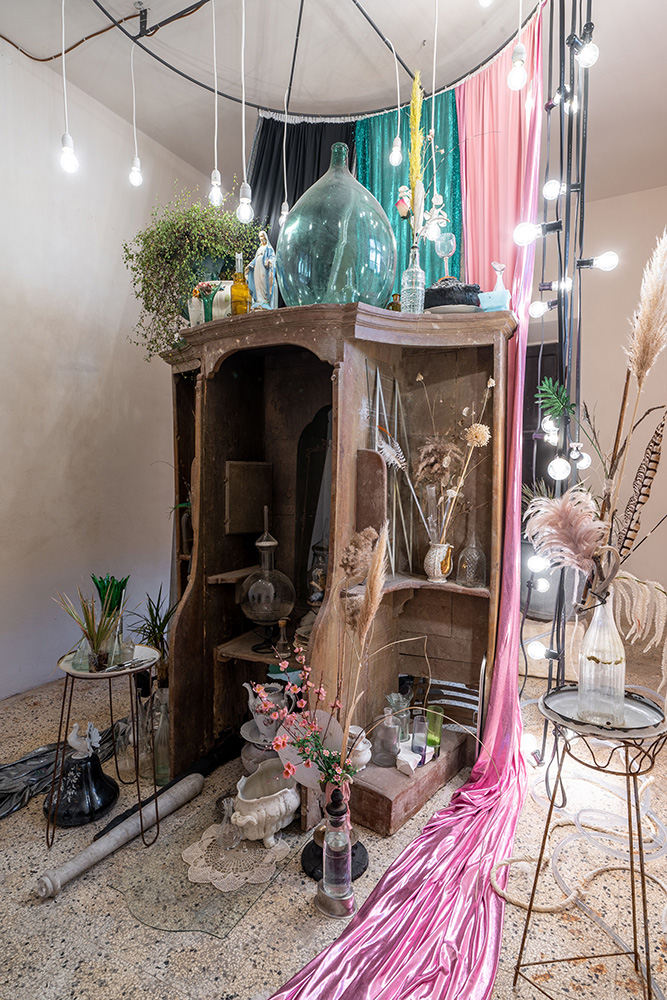 Tende e drappi lucenti e cangianti incorniciano gli altari della sala, che ospitano l’acqua, fonte prodigiosa. Una pala all’altare raffigura una composizione di rami e verdi foglie, elementi vivi di madre natura. Un vecchio confessionale, divenuto lui stesso altare, raccoglie e costudisce memorie. L’istallazione si completa di piante terrestri e acquatiche, filari di luci, come quelle usate per le feste di paese.