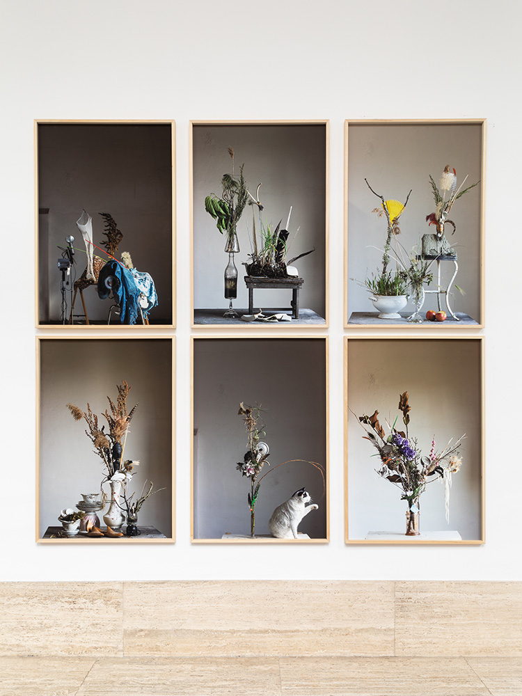 Lo spostamento del punto di vista segna alla radice tutto il progetto espositivo. Se le foto del ciclo Still Life si relazionano a un’idea di natura morta, quelle di A tutti gli effetti svelano la provvisorietà di un set in attesa di essere inquadrato. Nel ciclo Aste, le fotografie si trasformano in vaghi trofei “surrealisti”, sospesi nel nulla e decontestualizzati, lontani ormai dall’idea del genere pittorico di partenza, mentre Equilibri precari. Elevazioni reintroduce la presenza dell’artista, mettendo in luce l’elemento performativo insito in ogni natura morta, dove gli oggetti sono accuratamente predisposti dall’artista secondo precise regole compositive.