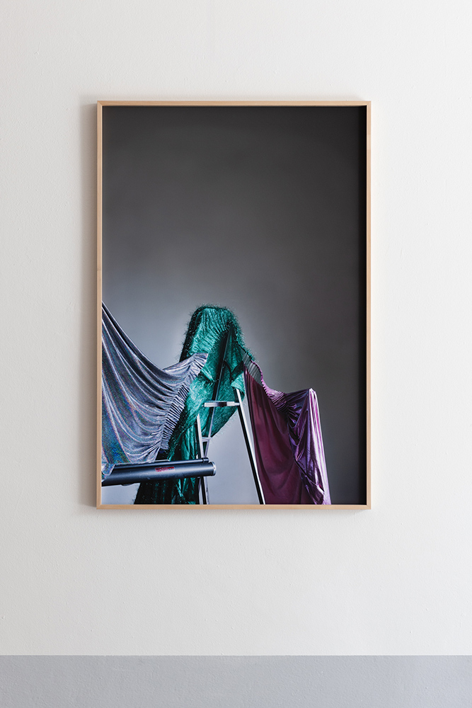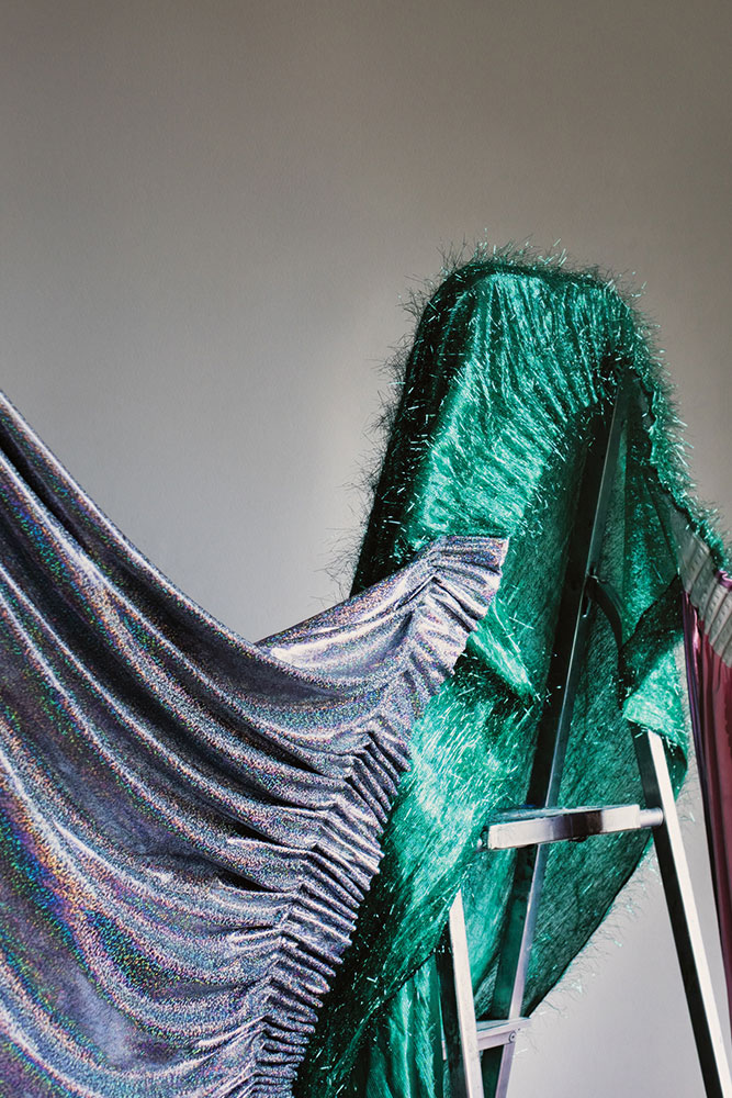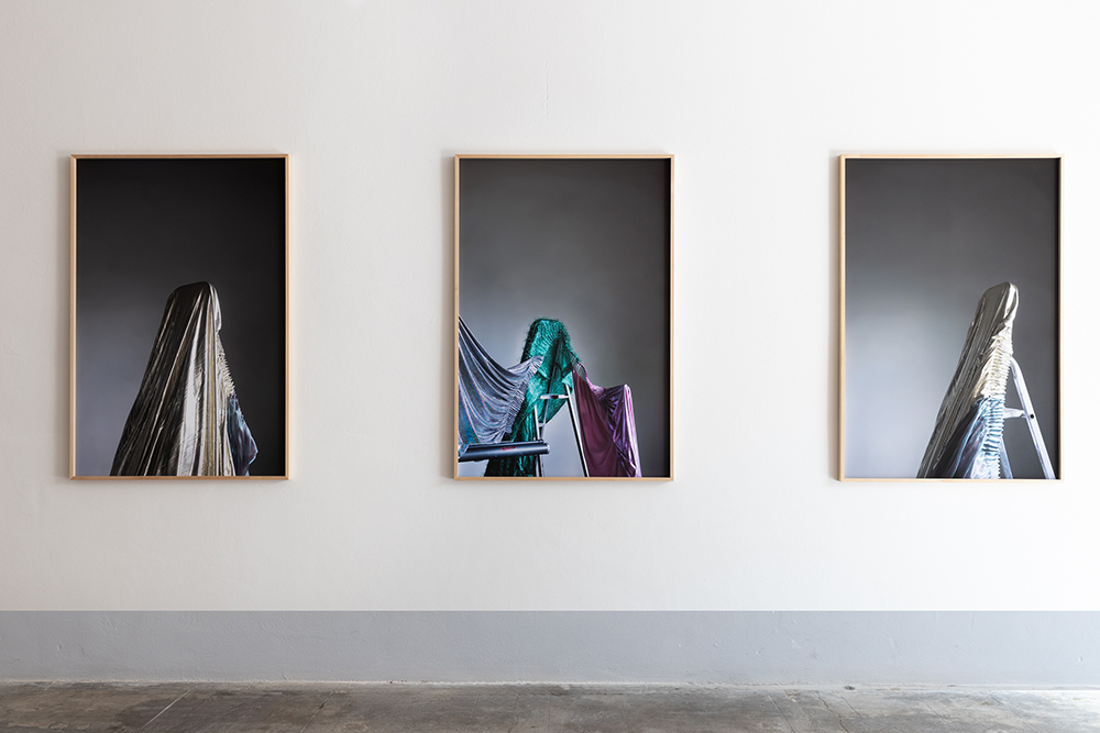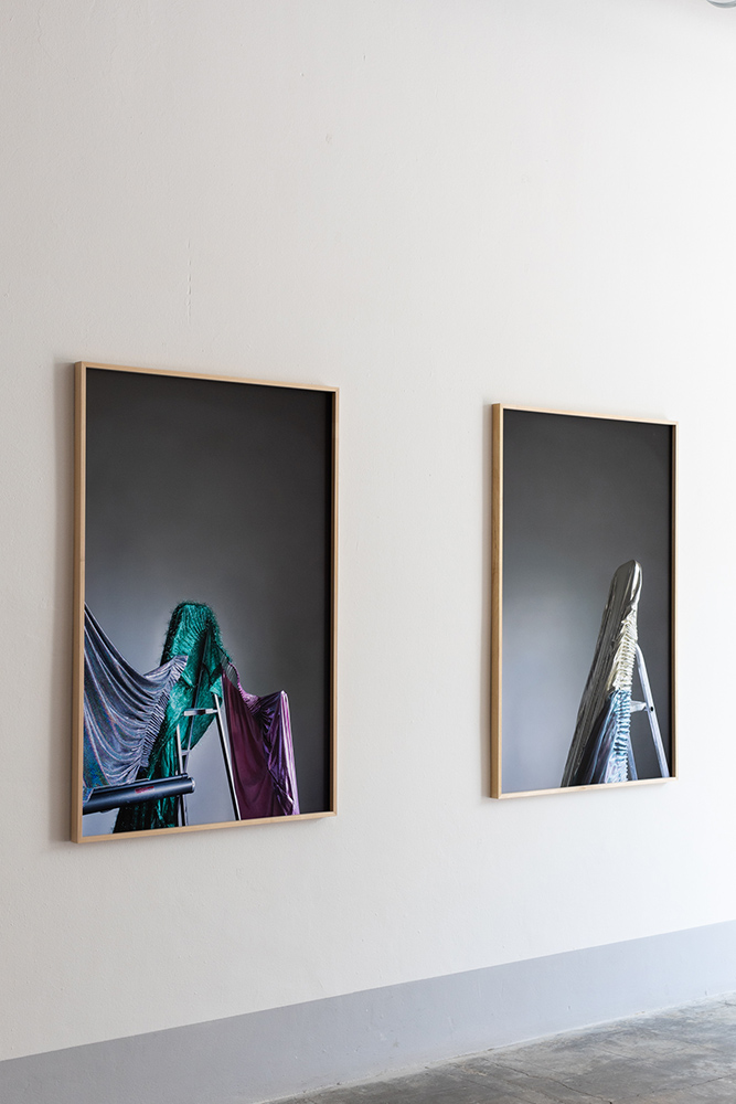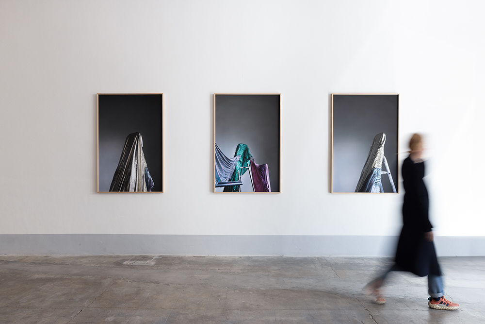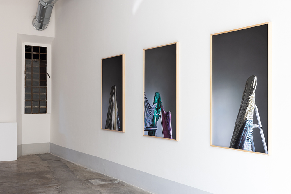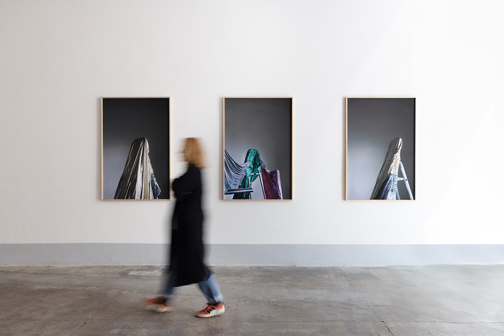 Nella serie Scalei (panneggi) pochi tessuti drappeggiati su una scala sono sufficienti per creare il pathos di una scena sacra. La figura femminile a sinistra è assorta in una visione che immaginiamo essere una deposizione dalla croce nel pannello centrale del trittico, dove il panneggio di stoffe lucenti simula traiettorie di corpi e arti che sorreggono il corpo di Cristo. Nell’ultima pala del polittico un’altra figura (la stessa?) si allontana dall’epicentro della passione. Non ci è dato sapere se sia Maria, la Maddalena, o una santa imprecisata. Pressoché identiche ma divergenti nelle andature e nel portamento della veste, avvolta attorno al corpo in un casto raccoglimento nel dolore o indossata come un velo che cade all’indietro per scoprirsi sul davanti. Entrambe sublimi nello scintillio dei panneggi scolpiti dalla luce, comparse di un tableau vivant, tra sacro e profano, pittura e scultura.
