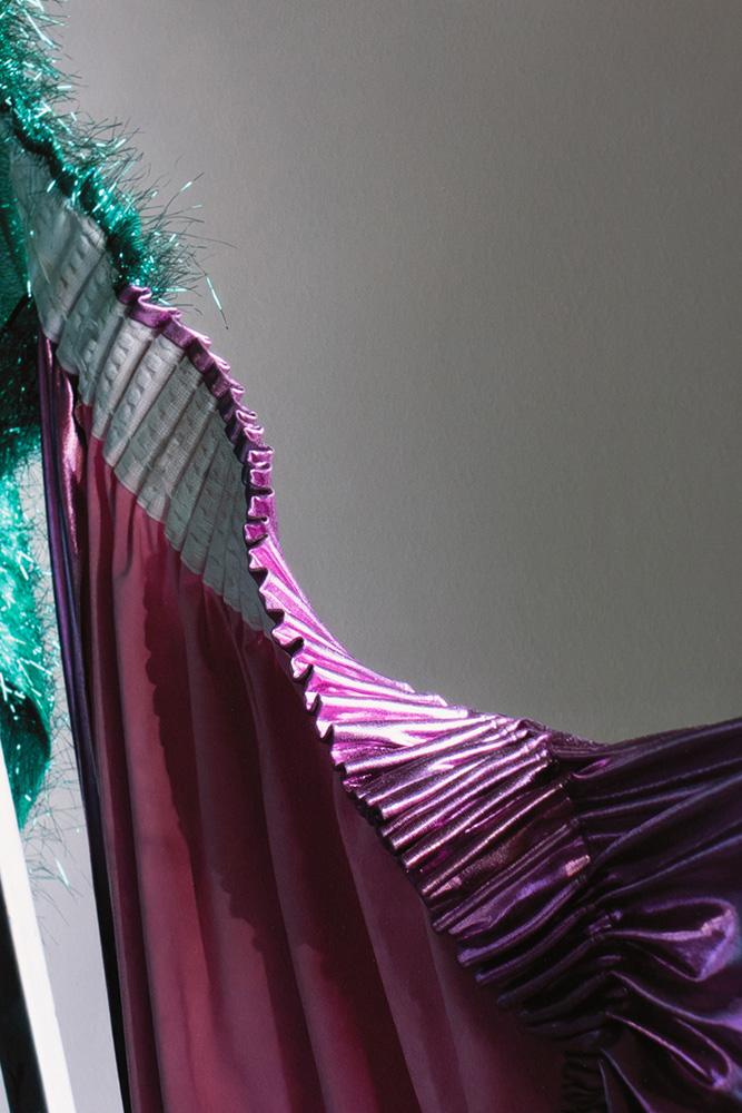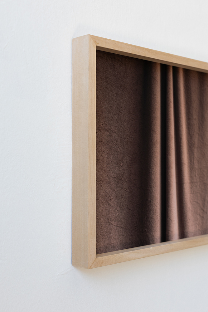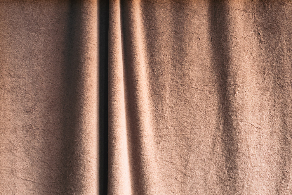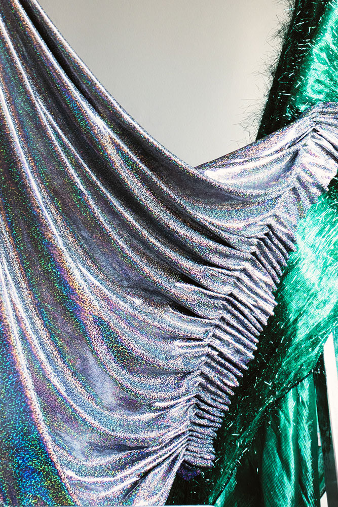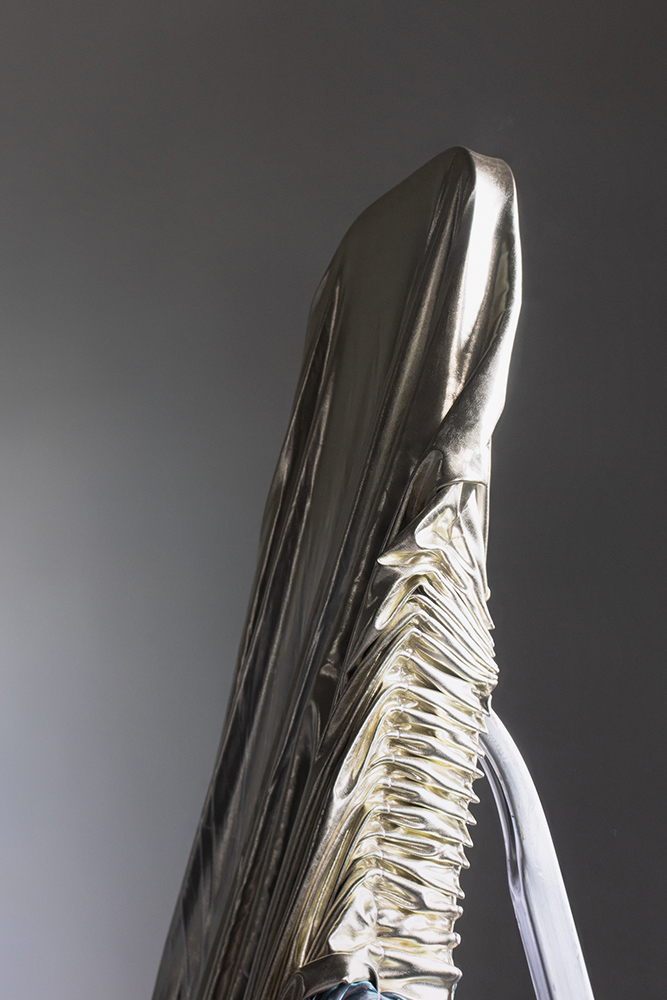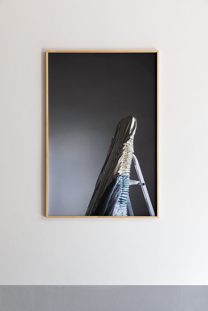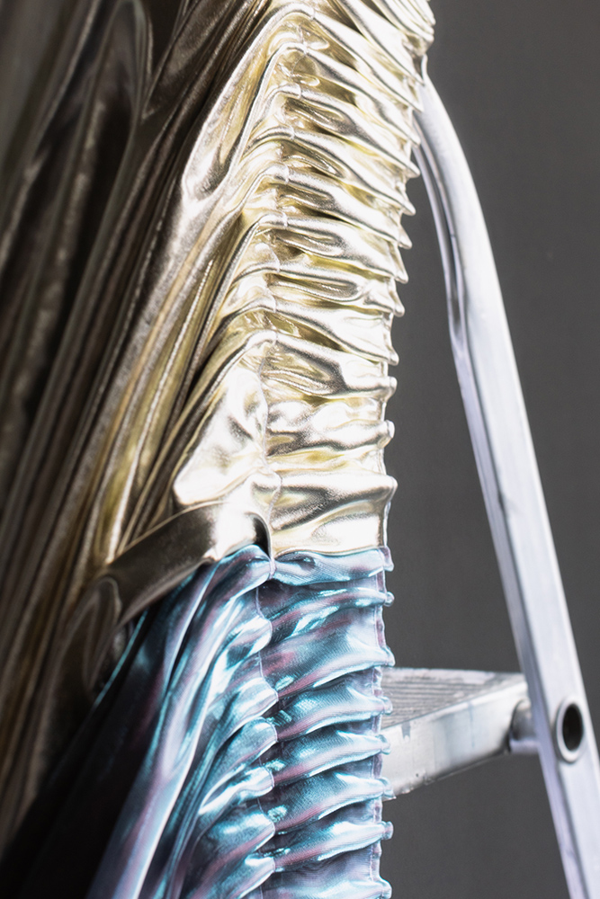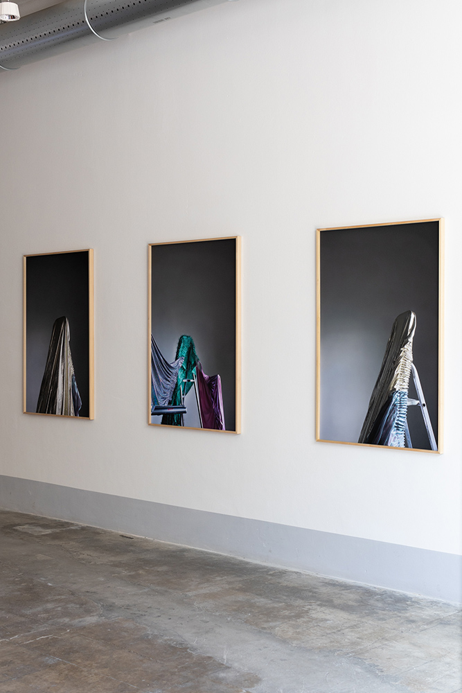 Nella serie Scalei (panneggi) pochi tessuti drappeggiati su una scala sono sufficienti per creare il pathos di una scena sacra. La figura femminile a sinistra è assorta in una visione che immaginiamo essere una deposizione dalla croce nel pannello centrale del trittico, dove il panneggio di stoffe lucenti simula traiettorie di corpi e arti che sorreggono il corpo di Cristo. Nell’ultima pala del polittico un’altra figura (la stessa?) si allontana dall’epicentro della passione. Non ci è dato sapere se sia Maria, la Maddalena, o una santa imprecisata. Pressoché identiche ma divergenti nelle andature e nel portamento della veste, avvolta attorno al corpo in un casto raccoglimento nel dolore o indossata come un velo che cade all’indietro per scoprirsi sul davanti. Entrambe sublimi nello scintillio dei panneggi scolpiti dalla luce, comparse di un tableau vivant, tra sacro e profano, pittura e scultura.