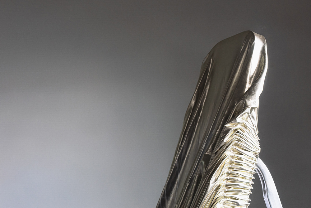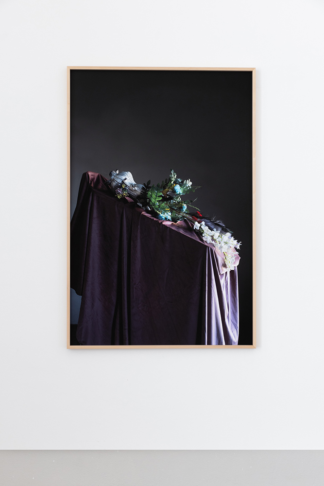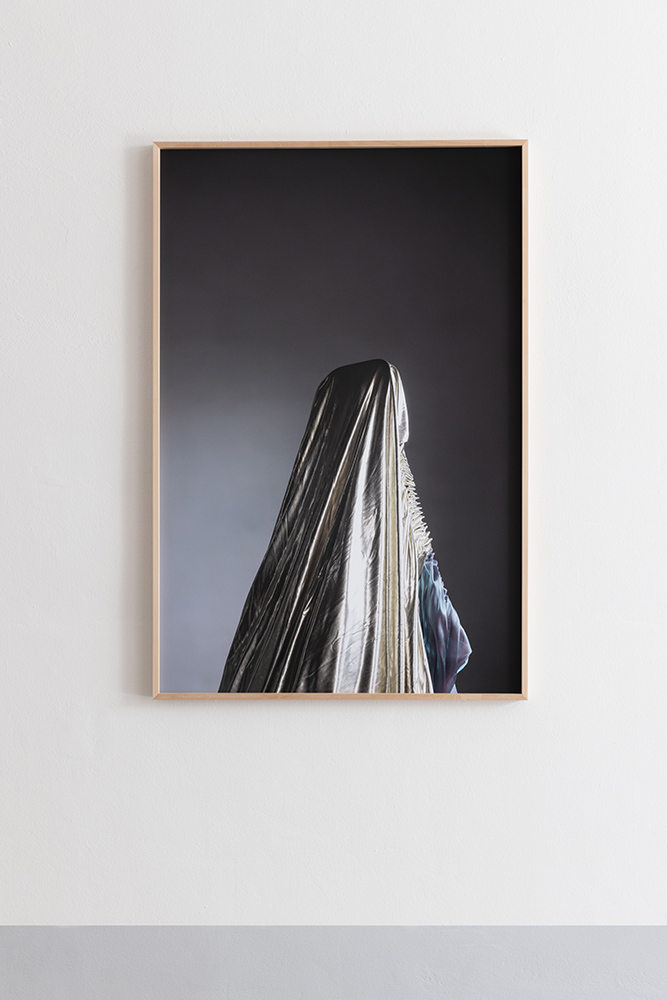 Quando questa scena si svuota e il tessuto diventa protagonista, entrano in campo figure e pose che si richiamano alla tradizione della pittura sacra. E così il genere della natura morta, che finora ha circoscritto la totalità della produzione fotografica dell’artista, seppur costantemente rimodulato da una vitalità performativa e dal meccanismo dello svelamento scenico, si contamina con quello del tableau vivant, dove la composizione si carica di una tensione narrativa latente, producendo immagini metamorfiche e dalla temporalità reversibile, sospese tra stasi e movimento, visibile e non visibile. Già presente nelle installazioni come tenda o quinta scenografica, la materia tessile fa qui il suo ingresso in scena come panneggio, interfaccia dell’atto e della potenza 2 nel dispiegarsi della piega e nuovo strumento compositivo nelle mani dell’artista che adesso modella figure virtuali, animate da un’intensità che fa esistere i corpi nelle inflessioni del tessuto.