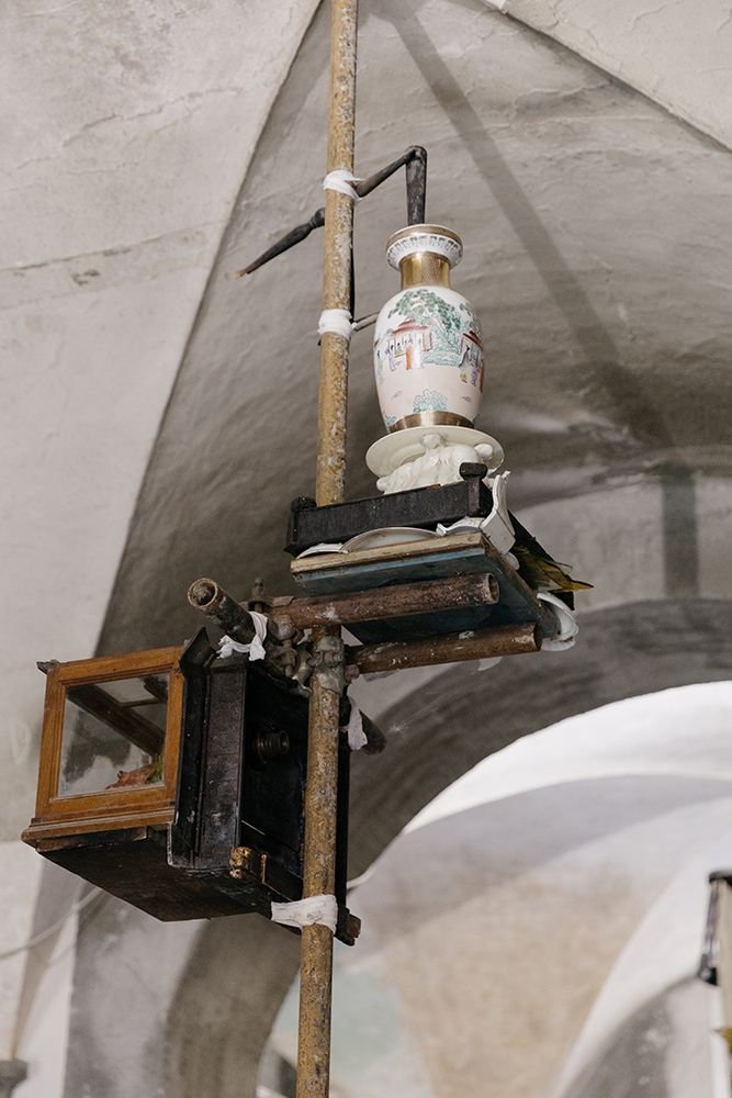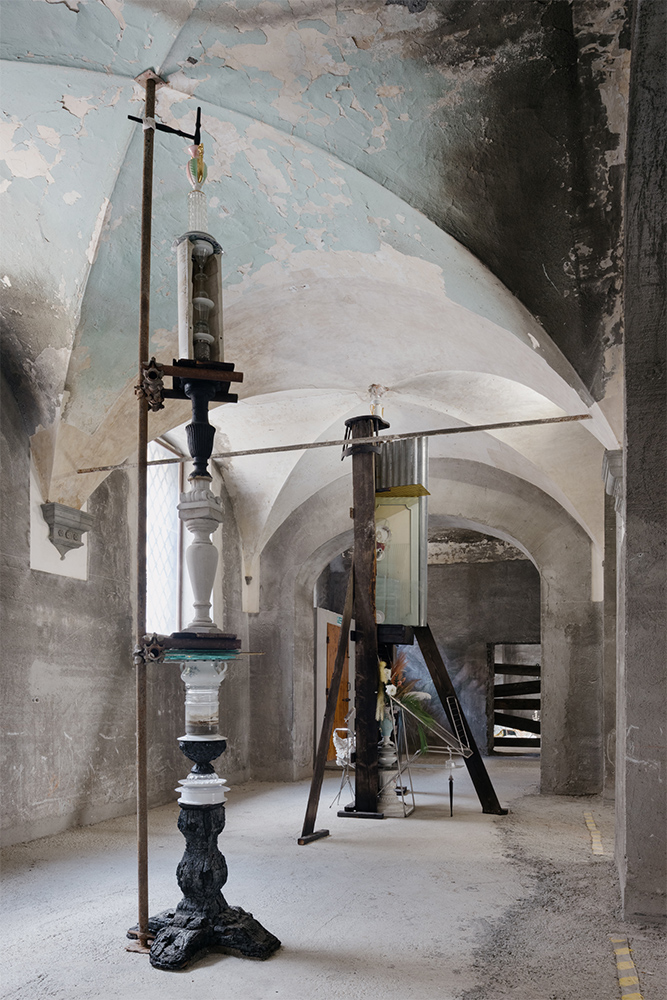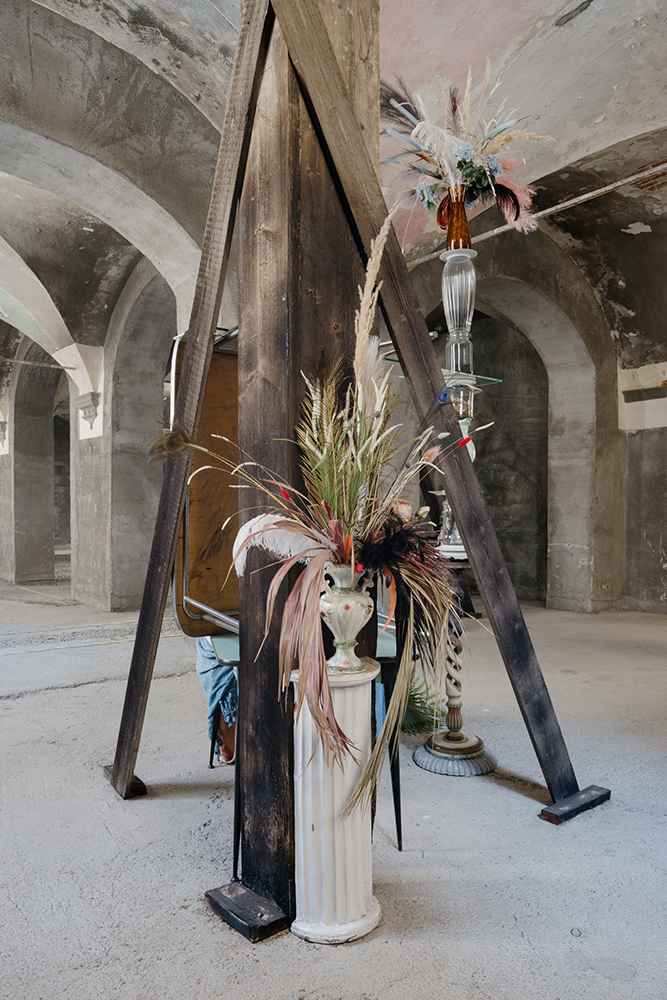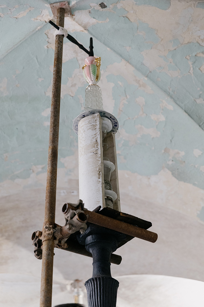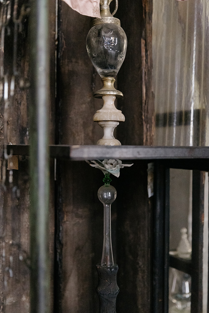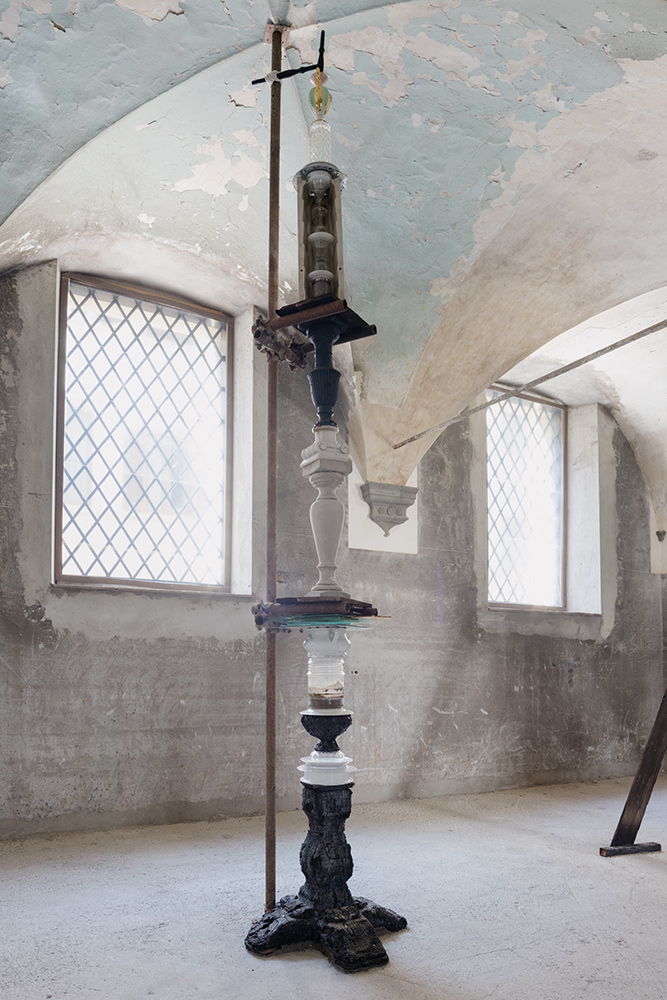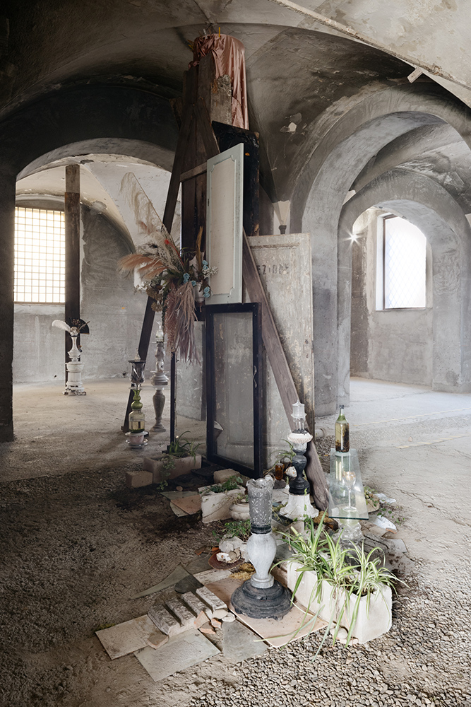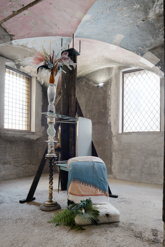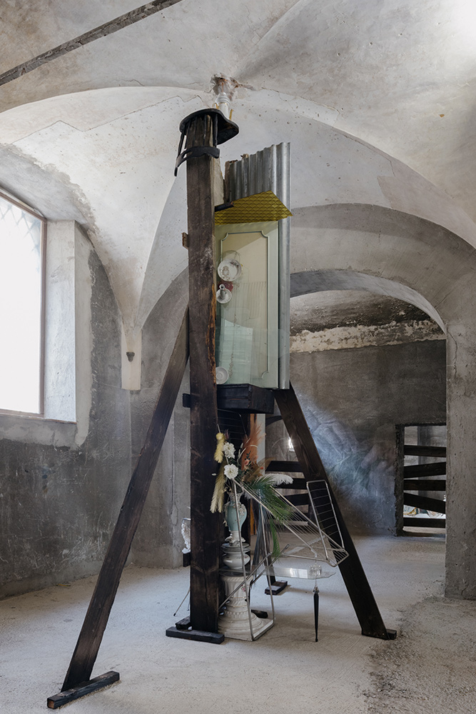 Chiara Bettazzi è attratta dai luoghi liminali, abbandonati o dimenticati, in cui attiva nuove narrazioni attraverso l’assemblaggio di materiali raccolti sul posto o nel tempo. Le sue “colonne della memoria” si innestano nell’antica spezieria, evocandone le plurime stratificazioni: da farmacia monastica (vasi, ampolle), a laboratorio di “rapé”, ovvero potente tabacco da fiuto, di cui resta il “relitto” della porta dell’ufficio della direzione di Manifattura Tabacchi. Le parti carbonizzate rimandano a un incendio del 1960, mentre l’affastellamento degli oggetti ricorda gli arredi provvisori del centro profughi allestito a Sant’Orsola nel secondo dopoguerra. Piante spontanee crescono tra i materiali, segni di una persistenza organica che sfida l’inorganico. L’opera si configura come un archivio materico, dove ogni frammento è traccia da interrogare.