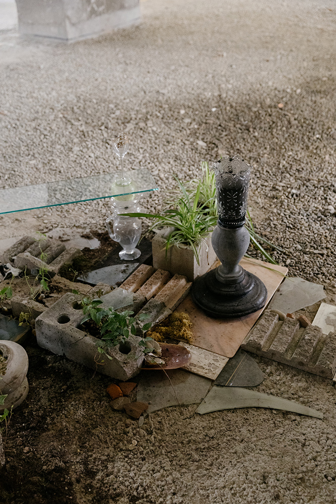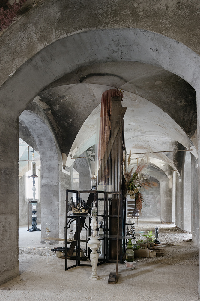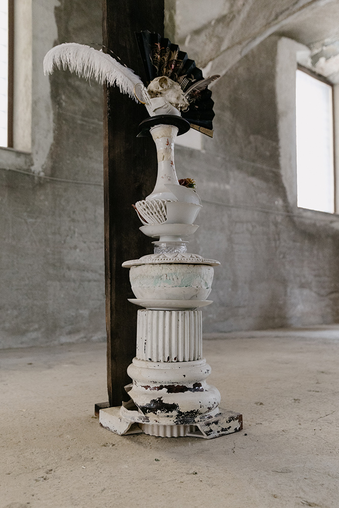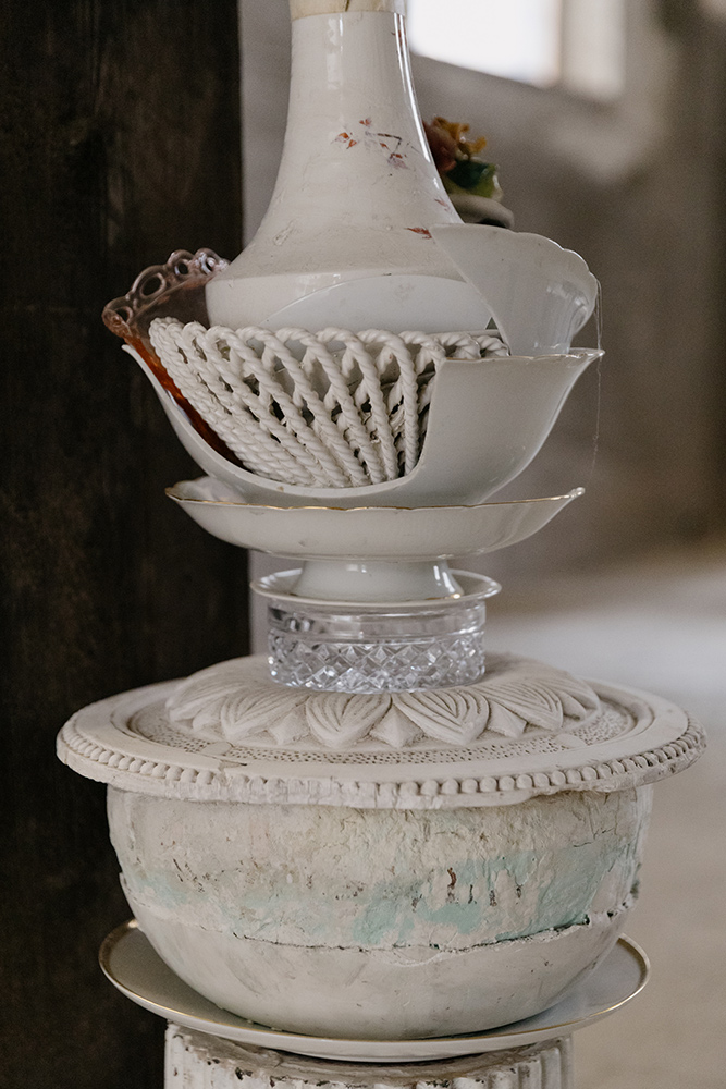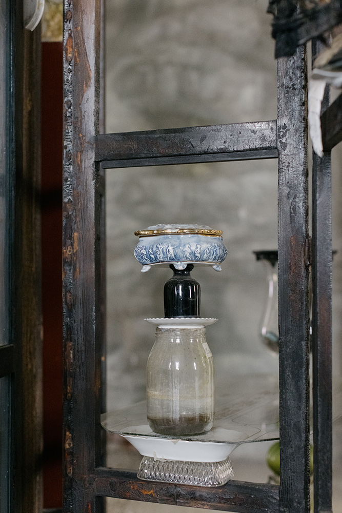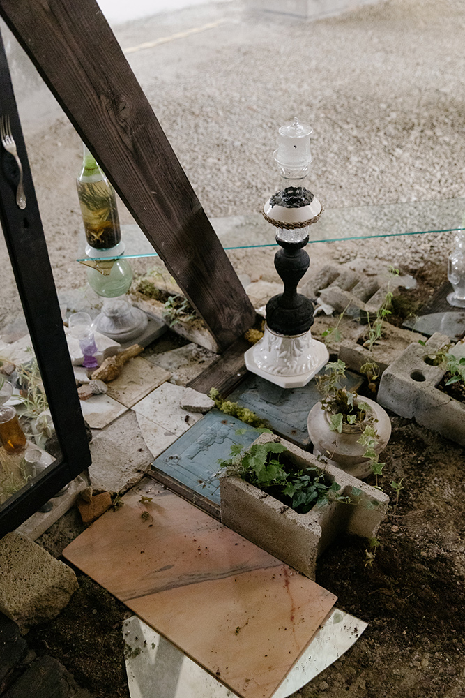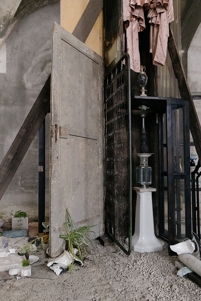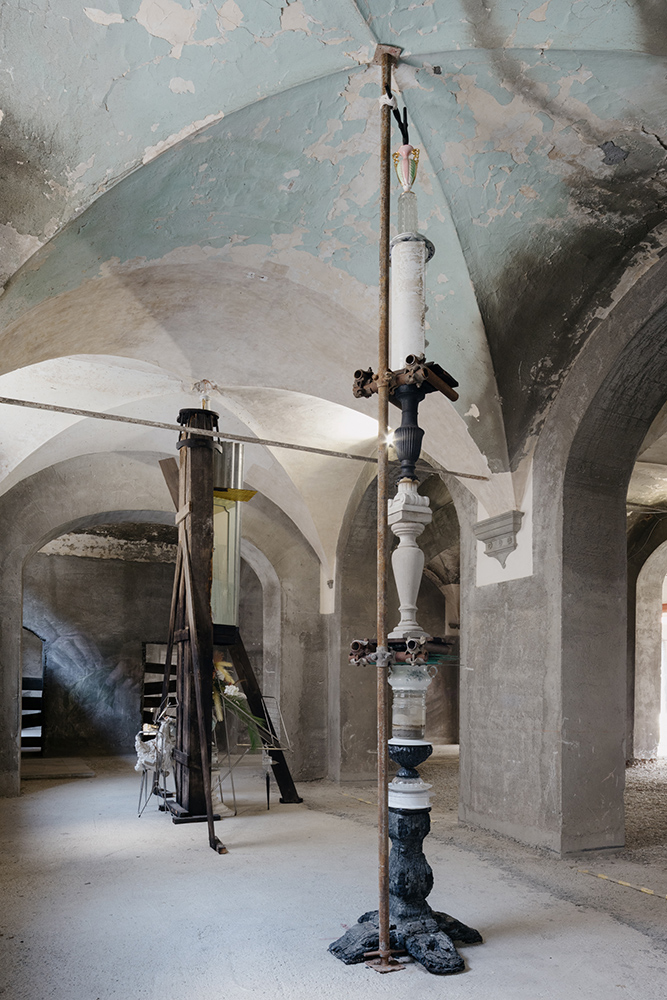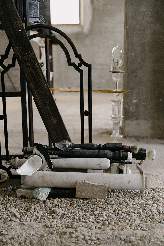 Chiara Bettazzi è attratta dai luoghi liminali, abbandonati o dimenticati, in cui attiva nuove narrazioni attraverso l’assemblaggio di materiali raccolti sul posto o nel tempo. Le sue “colonne della memoria” si innestano nell’antica spezieria, evocandone le plurime stratificazioni: da farmacia monastica (vasi, ampolle), a laboratorio di “rapé”, ovvero potente tabacco da fiuto, di cui resta il “relitto” della porta dell’ufficio della direzione di Manifattura Tabacchi. Le parti carbonizzate rimandano a un incendio del 1960, mentre l’affastellamento degli oggetti ricorda gli arredi provvisori del centro profughi allestito a Sant’Orsola nel secondo dopoguerra. Piante spontanee crescono tra i materiali, segni di una persistenza organica che sfida l’inorganico. L’opera si configura come un archivio materico, dove ogni frammento è traccia da interrogare.