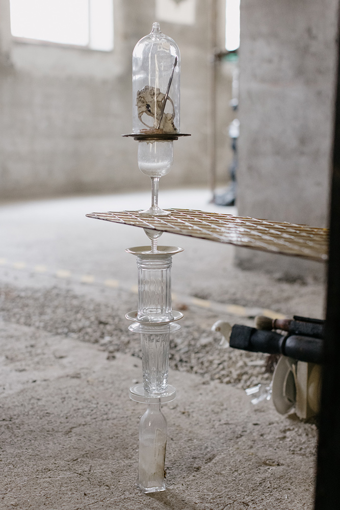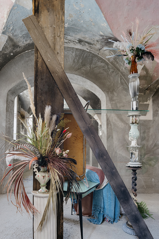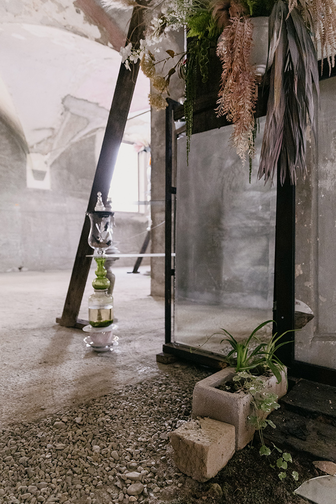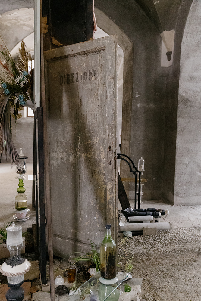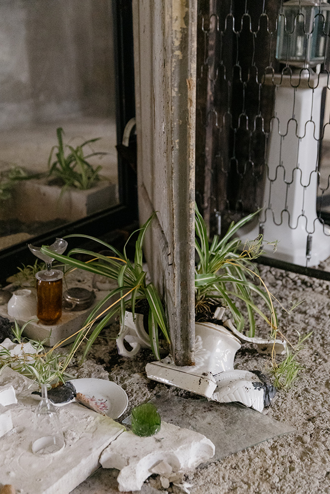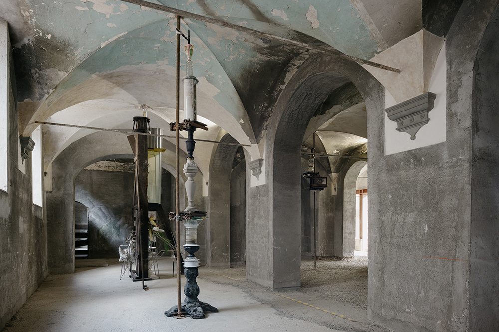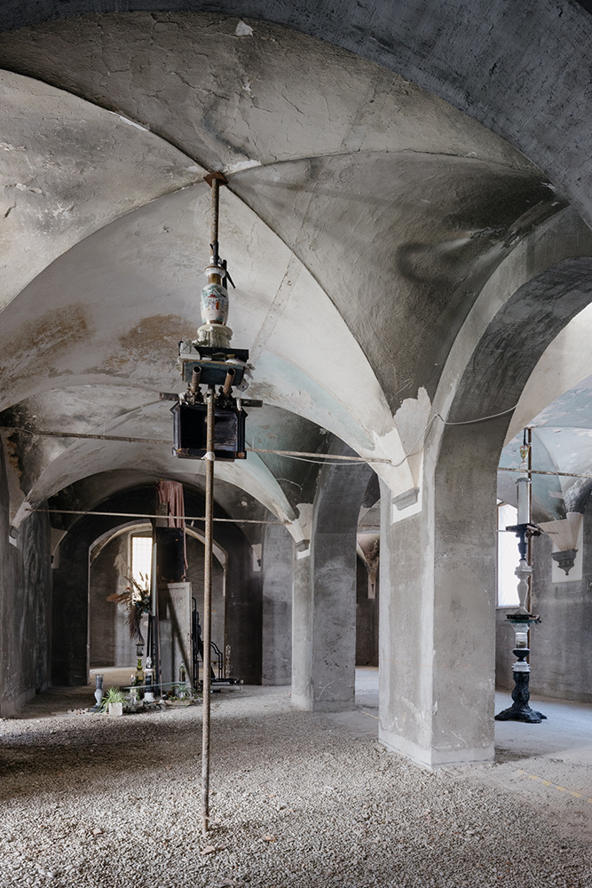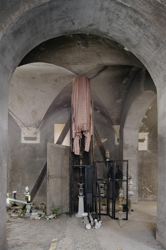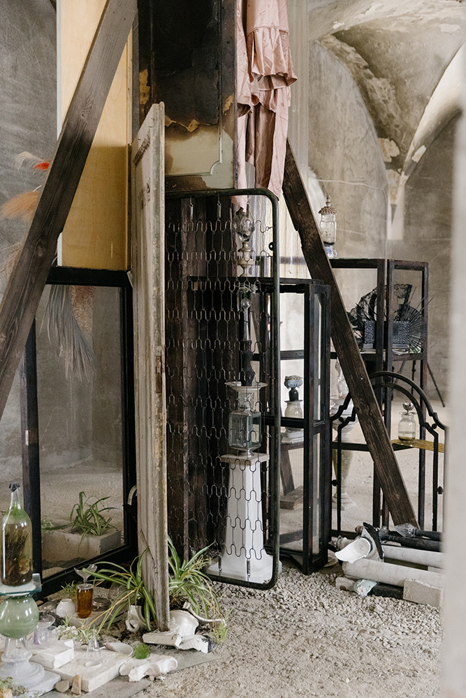Chiara Bettazzi è attratta dai luoghi liminali, abbandonati o dimenticati, in cui attiva nuove narrazioni attraverso l’assemblaggio di materiali raccolti sul posto o nel tempo. Le sue “colonne della memoria” si innestano nell’antica spezieria, evocandone le plurime stratificazioni: da farmacia monastica (vasi, ampolle), a laboratorio di “rapé”, ovvero potente tabacco da fiuto, di cui resta il “relitto” della porta dell’ufficio della direzione di Manifattura Tabacchi. Le parti carbonizzate rimandano a un incendio del 1960, mentre l’affastellamento degli oggetti ricorda gli arredi provvisori del centro profughi allestito a Sant’Orsola nel secondo dopoguerra. Piante spontanee crescono tra i materiali, segni di una persistenza organica che sfida l’inorganico. L’opera si configura come un archivio materico, dove ogni frammento è traccia da interrogare.
