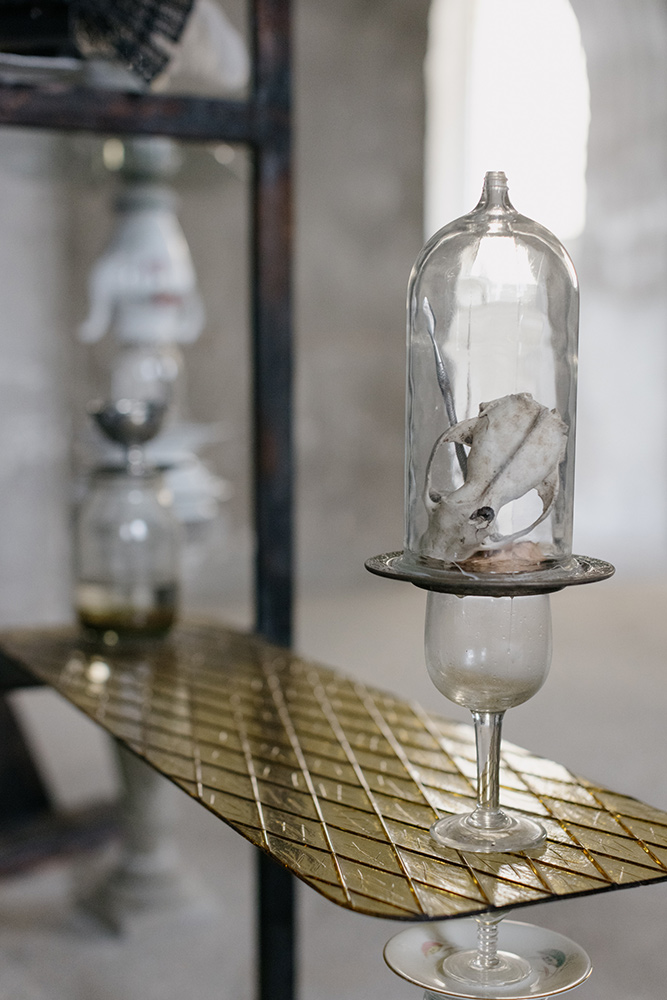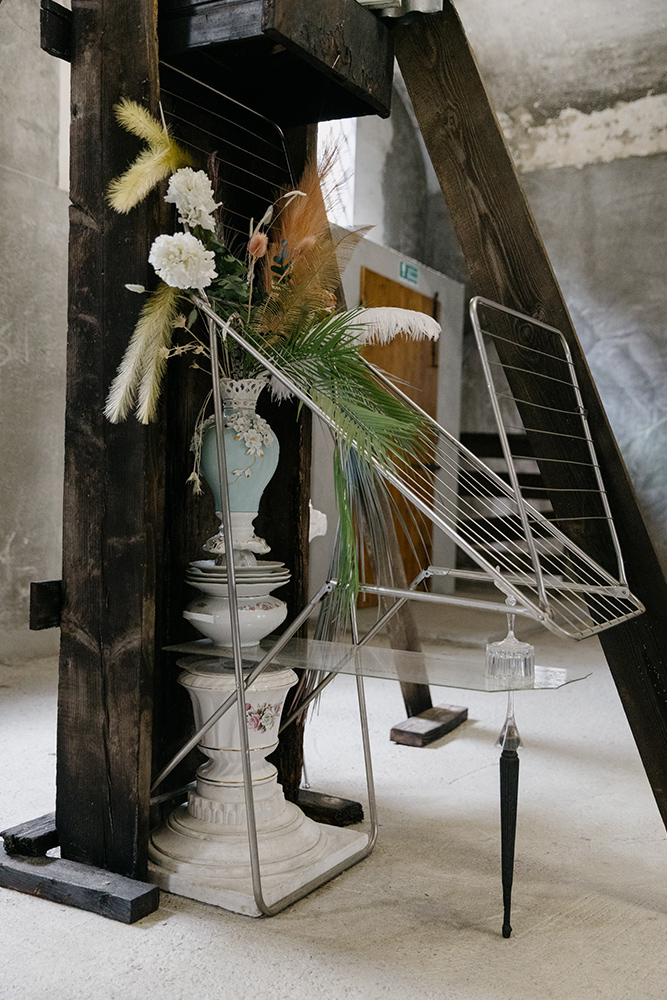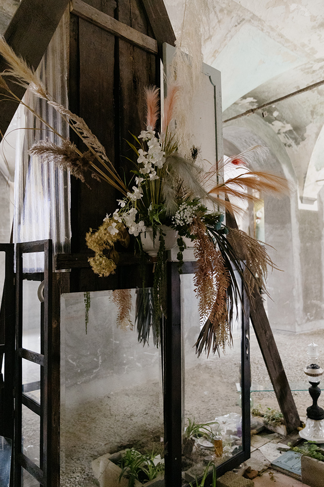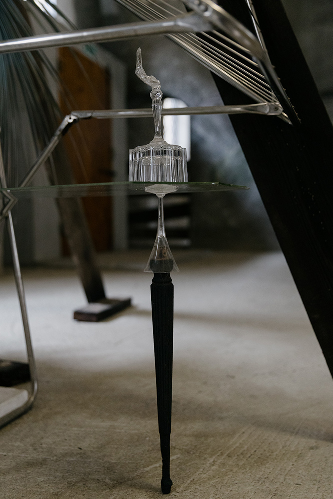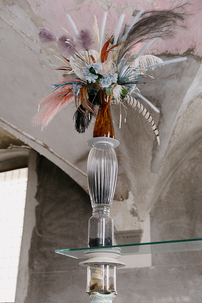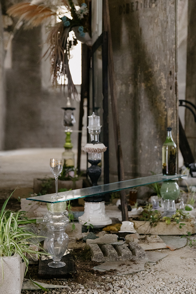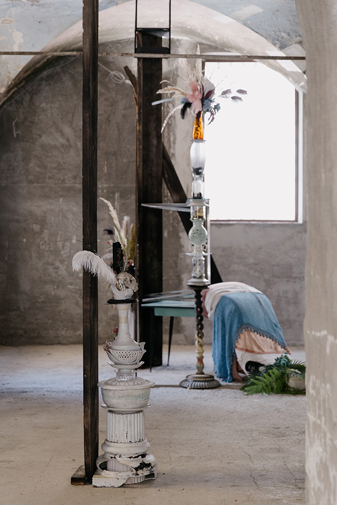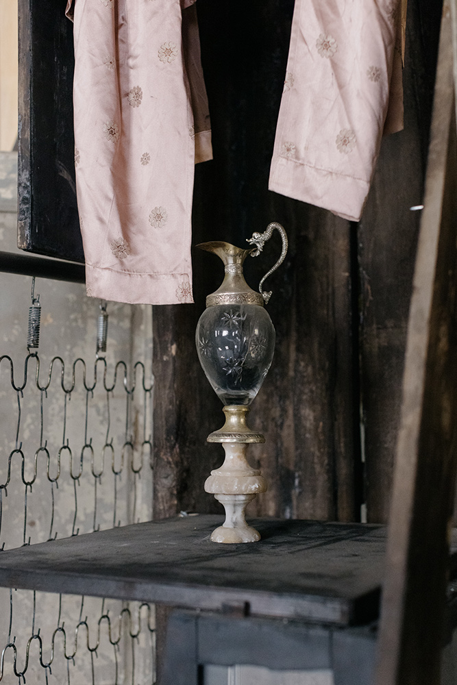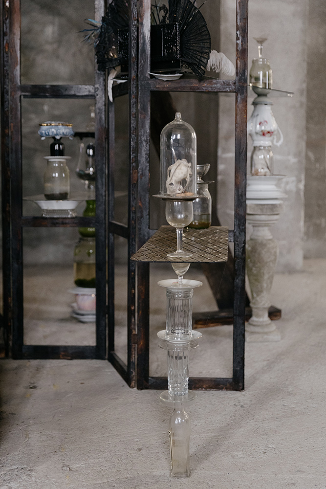 Chiara Bettazzi è attratta dai luoghi liminali, abbandonati o dimenticati, in cui attiva nuove narrazioni attraverso l’assemblaggio di materiali raccolti sul posto o nel tempo. Le sue “colonne della memoria” si innestano nell’antica spezieria, evocandone le plurime stratificazioni: da farmacia monastica (vasi, ampolle), a laboratorio di “rapé”, ovvero potente tabacco da fiuto, di cui resta il “relitto” della porta dell’ufficio della direzione di Manifattura Tabacchi. Le parti carbonizzate rimandano a un incendio del 1960, mentre l’affastellamento degli oggetti ricorda gli arredi provvisori del centro profughi allestito a Sant’Orsola nel secondo dopoguerra. Piante spontanee crescono tra i materiali, segni di una persistenza organica che sfida l’inorganico. L’opera si configura come un archivio materico, dove ogni frammento è traccia da interrogare.