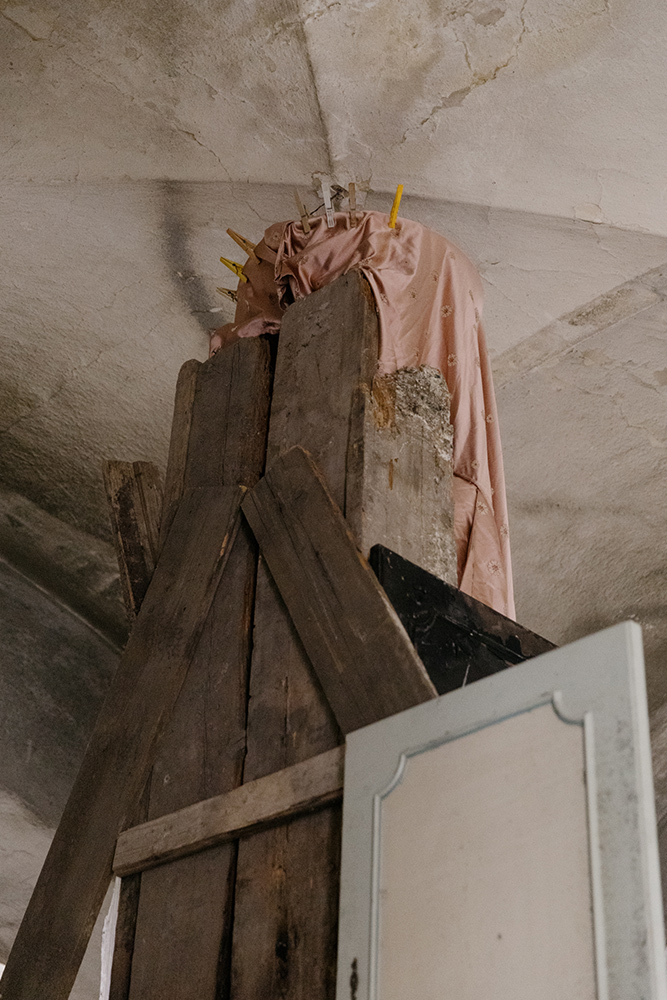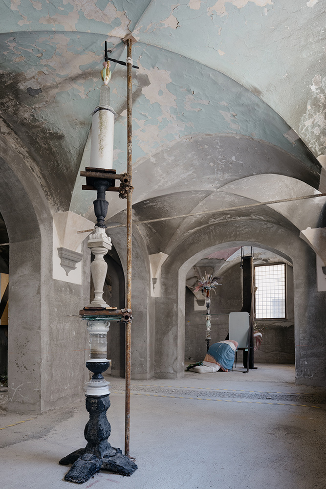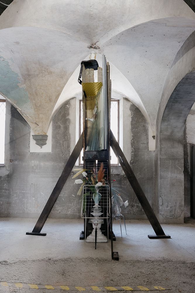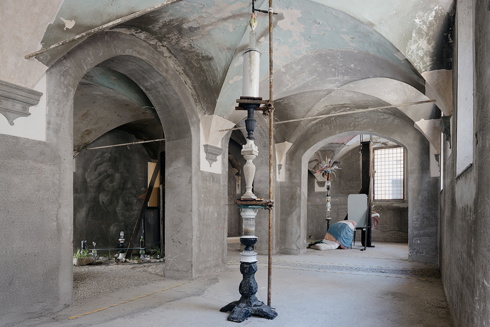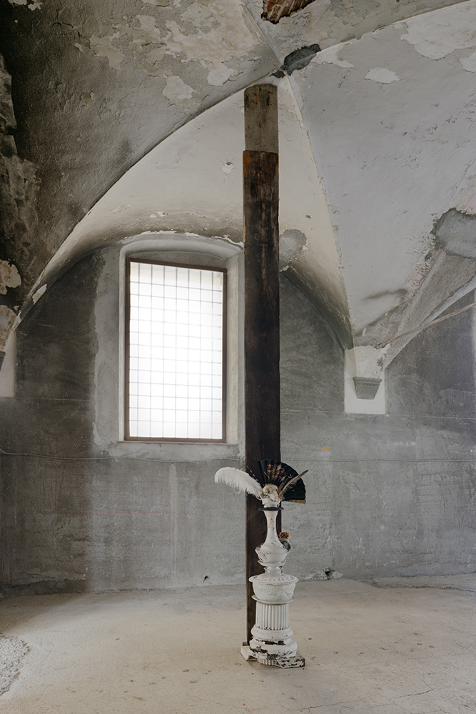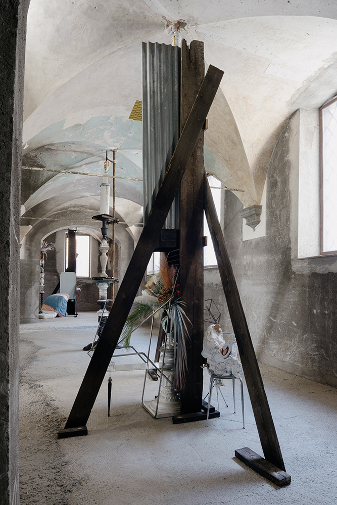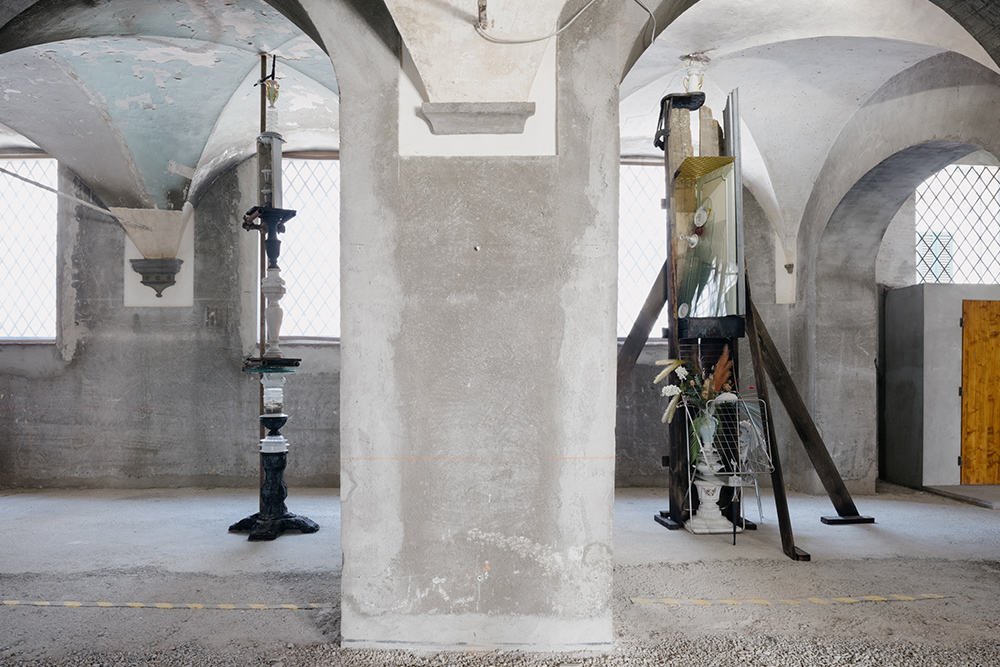 L’opera di Chiara Bettazzi si presenta come un monumento insieme fragile e potente, dedicato alle molte vite che hanno attraversato Sant’Orsola. Sei pilastri sono stati assemblati a partire da elementi artificiali e naturali: oggetti quotidiani o provenienti dal cantiere, spezzati, talvolta bruciati, piante autoctone. Le sculture dell’artista si innestano nei punti di intersezione delle volte dell’antica spezieria conventuale come totem. Queste “colonne della memoria” danno l’illusione di nuove strutture portanti, composte da frammenti di epoche diverse. Le loro composizioni ricordano nature morte dalla bellezza effimera. L’artista trasforma memorie individuali in memoria collettiva, attraverso un vocabolario di oggetti che sollecitano interrogativi: piccoli enigmi silenziosi, pronti a rivelarsi a chi sceglie davvero di esplorarli.