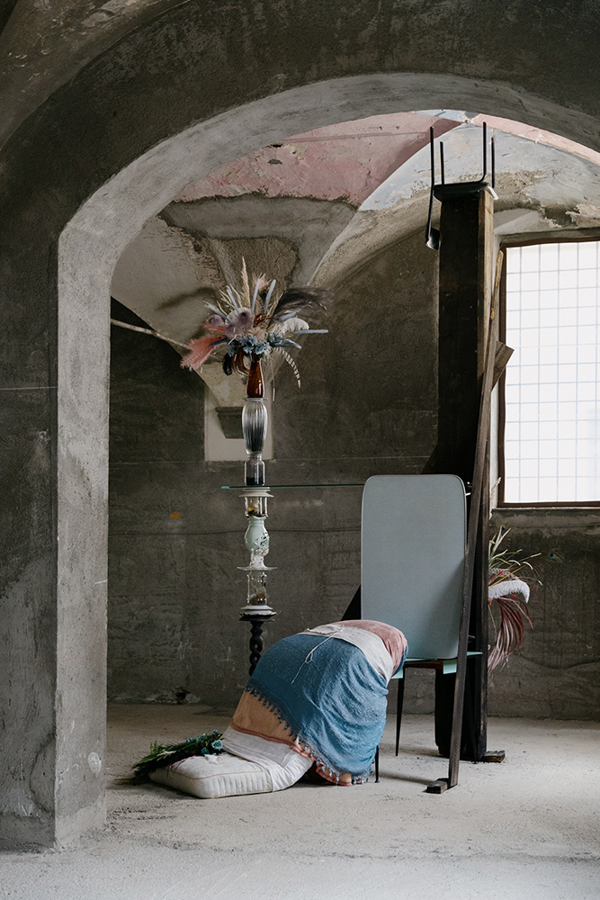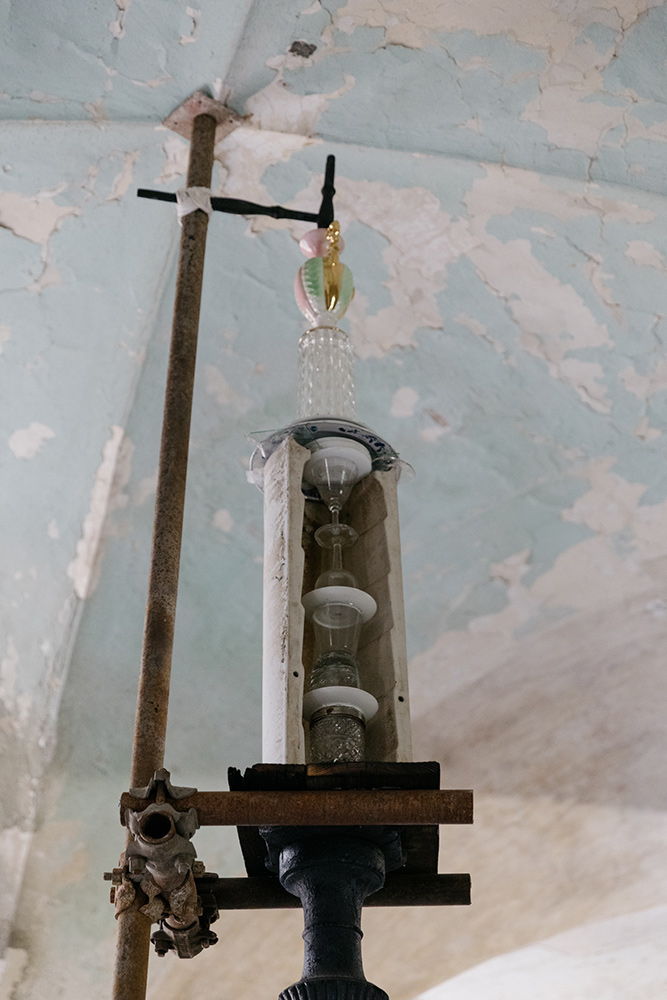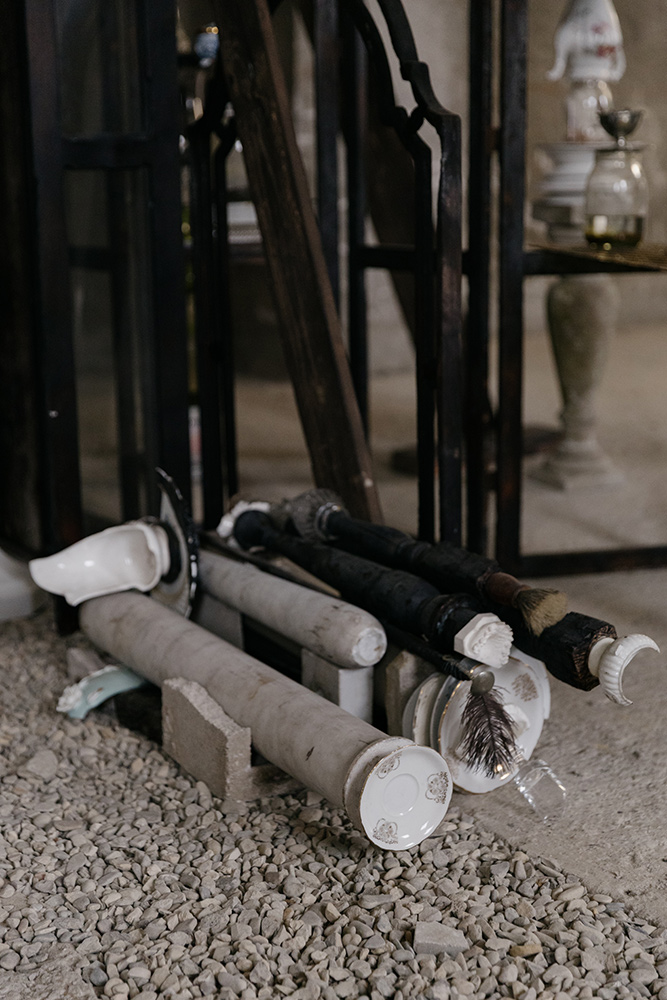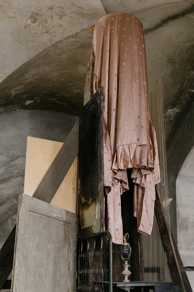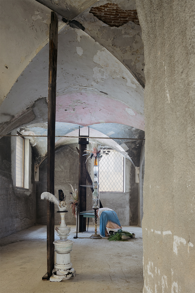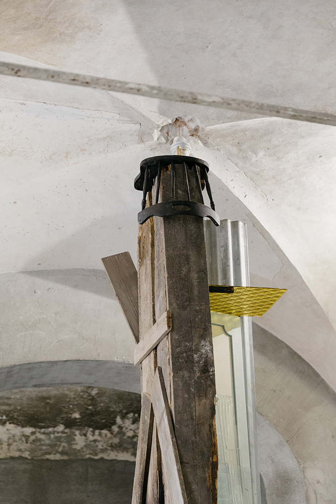 L’opera di Chiara Bettazzi si presenta come un monumento insieme fragile e potente, dedicato alle molte vite che hanno attraversato Sant’Orsola. Sei pilastri sono stati assemblati a partire da elementi artificiali e naturali: oggetti quotidiani o provenienti dal cantiere, spezzati, talvolta bruciati, piante autoctone. Le sculture dell’artista si innestano nei punti di intersezione delle volte dell’antica spezieria conventuale come totem. Queste “colonne della memoria” danno l’illusione di nuove strutture portanti, composte da frammenti di epoche diverse. Le loro composizioni ricordano nature morte dalla bellezza effimera. L’artista trasforma memorie individuali in memoria collettiva, attraverso un vocabolario di oggetti che sollecitano interrogativi: piccoli enigmi silenziosi, pronti a rivelarsi a chi sceglie davvero di esplorarli.