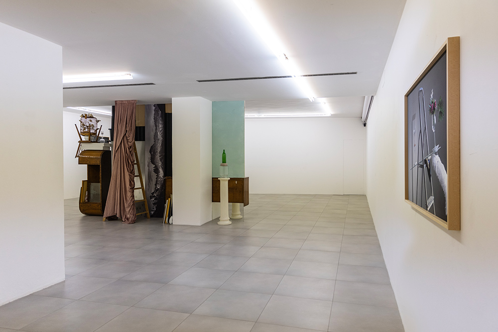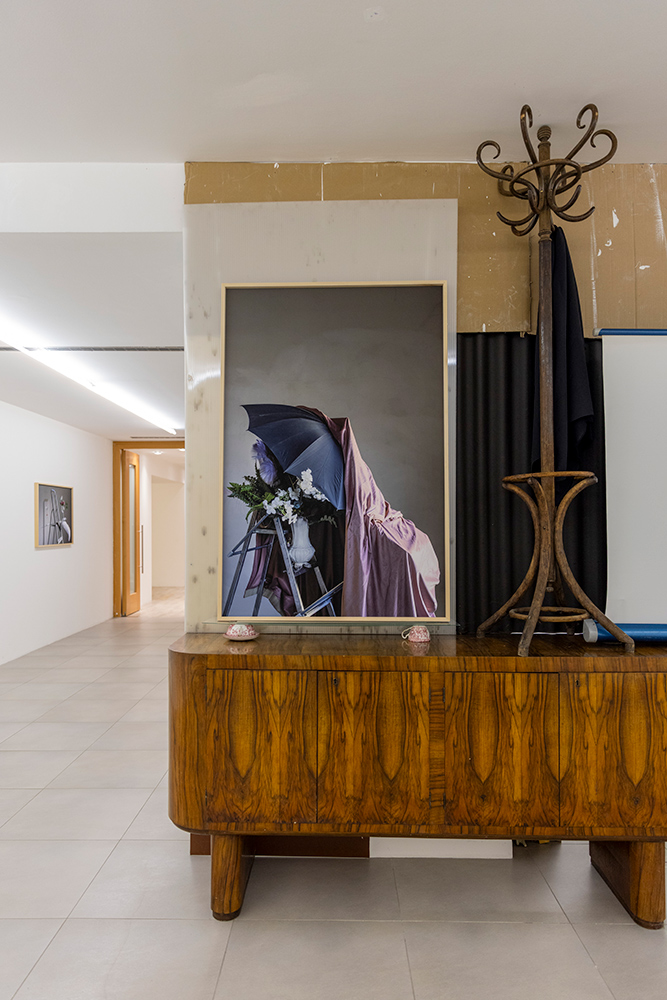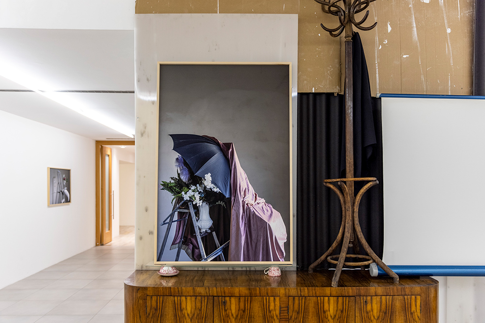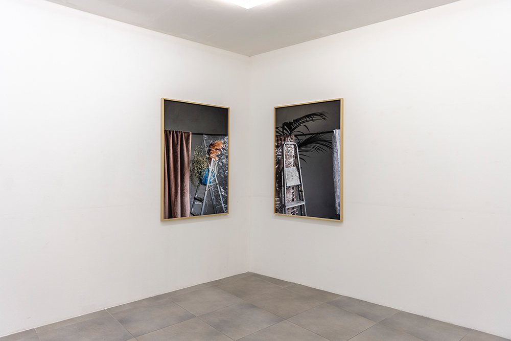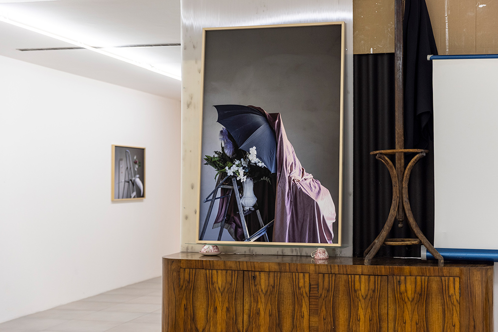 La mostra deriva da una riflessione sulla soglia come luogo del processo creativo e compositivo, territorio di accadimenti, ripiegamenti e inversioni, confine permeabile tra immagine e scultura — una soglia che può coincidere anche con una semplice quinta provvisoria, come un tessuto drappeggiato su un’asta di ferro, visibile in Scalei (2024). Le due fotografie sono qui parte integrante dell’installazione, con il loro debordare fisicamente nello spazio angolare della stanza, mentre un altro scaleo (Scalei. Disvelamento) entra nel corpo stesso della struttura, attivando un dialogo muto tra gli oggetti in scena: ombrello, panneggio, attaccapanni.