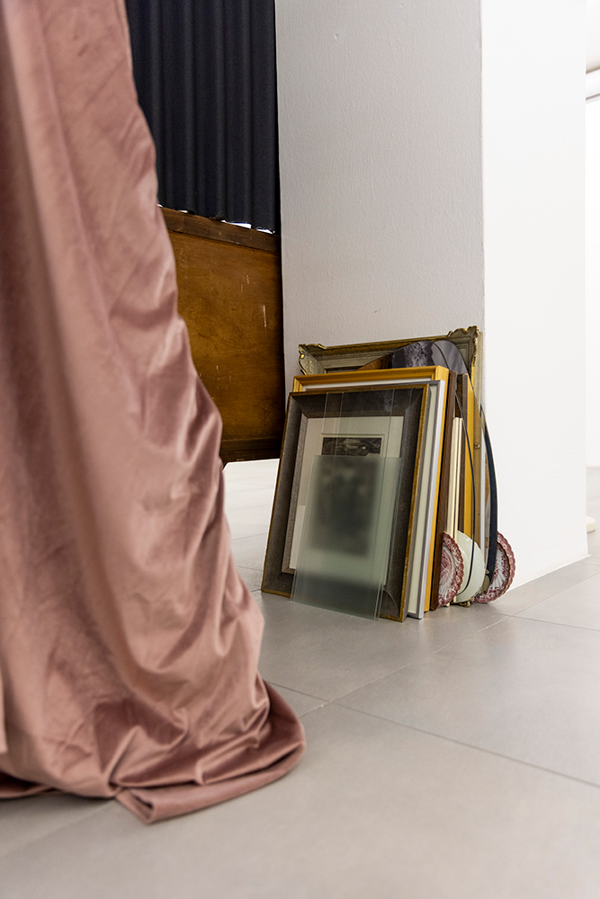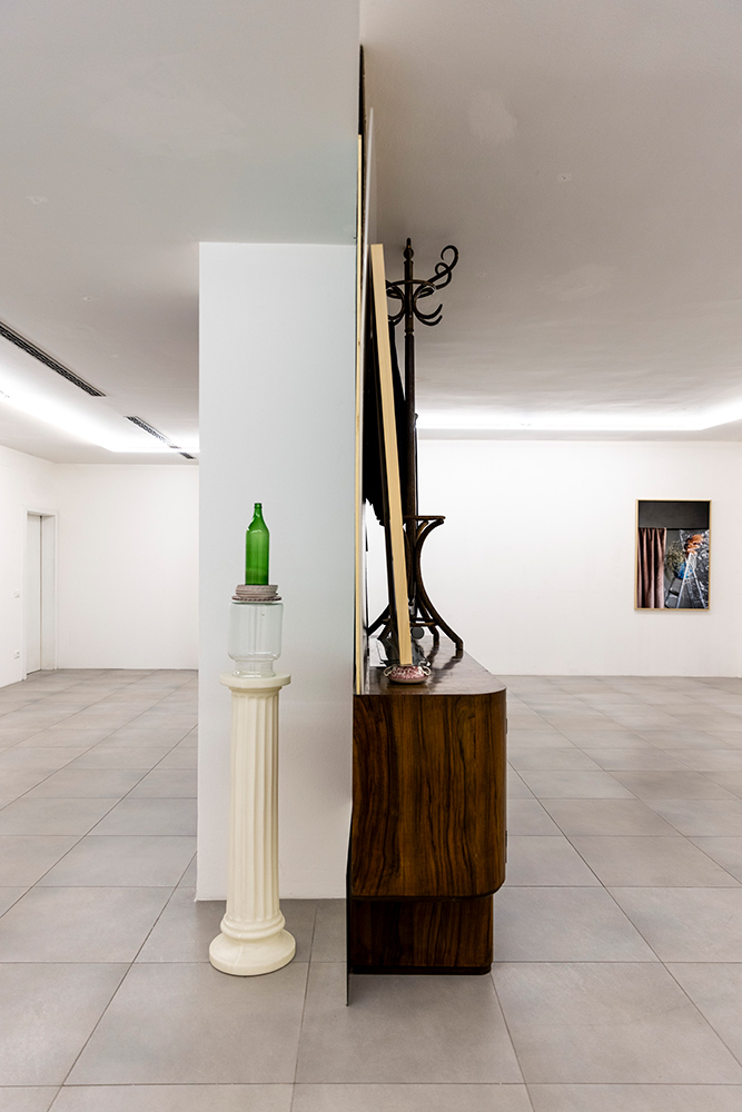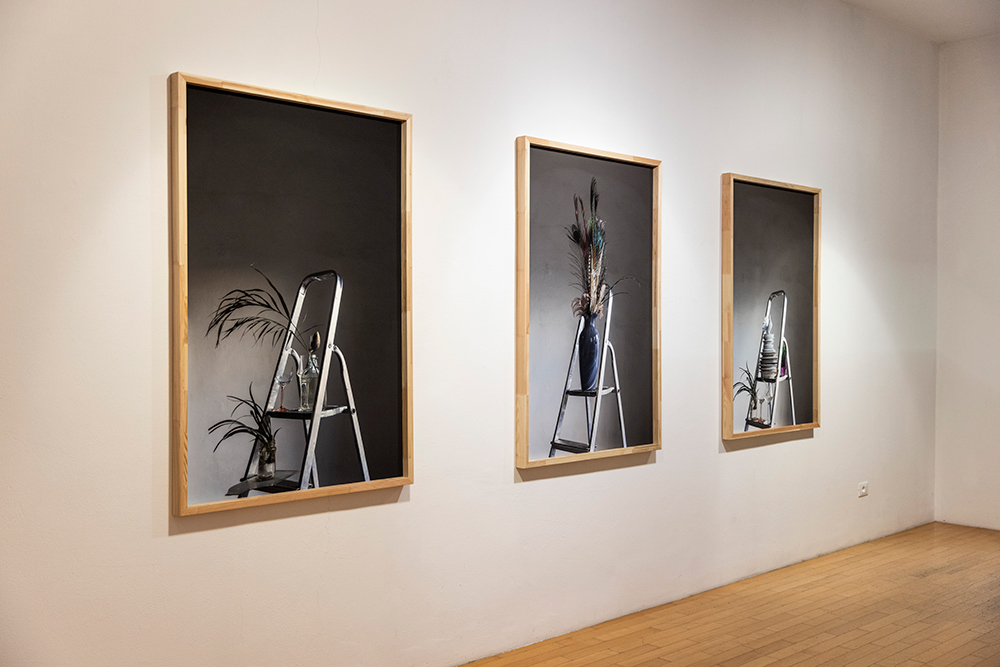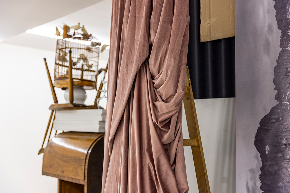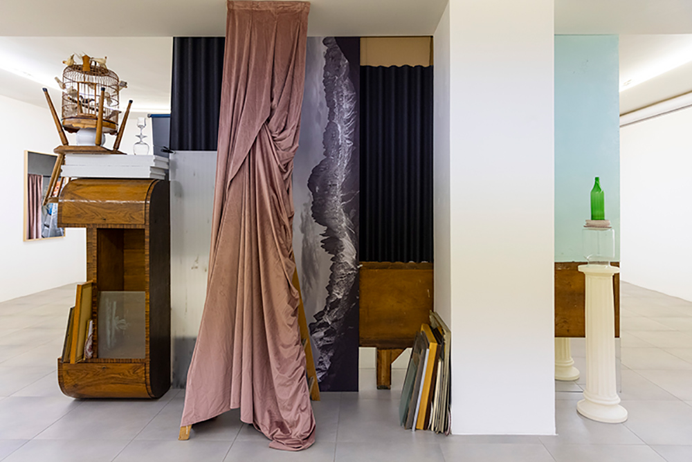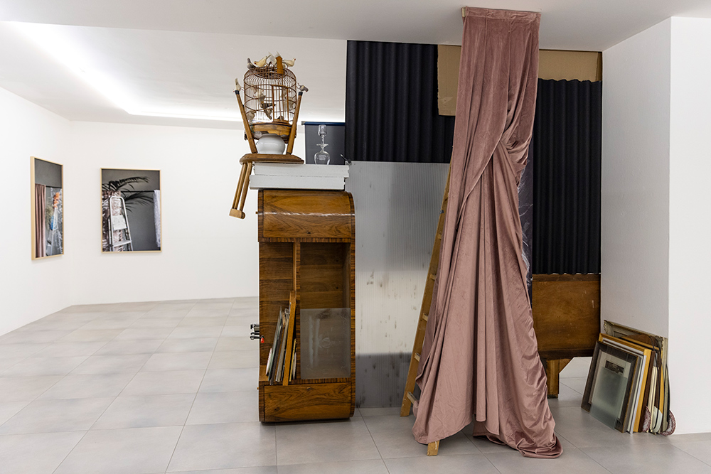 La mostra deriva da una riflessione sulla soglia come luogo del processo creativo e compositivo, territorio di accadimenti, ripiegamenti e inversioni, confine permeabile tra immagine e scultura — una soglia che può coincidere anche con una semplice quinta provvisoria, come un tessuto drappeggiato su un’asta di ferro, visibile in Scalei (2024). Le due fotografie sono qui parte integrante dell’installazione, con il loro debordare fisicamente nello spazio angolare della stanza, mentre un altro scaleo (Scalei. Disvelamento) entra nel corpo stesso della struttura, attivando un dialogo muto tra gli oggetti in scena: ombrello, panneggio, attaccapanni.
