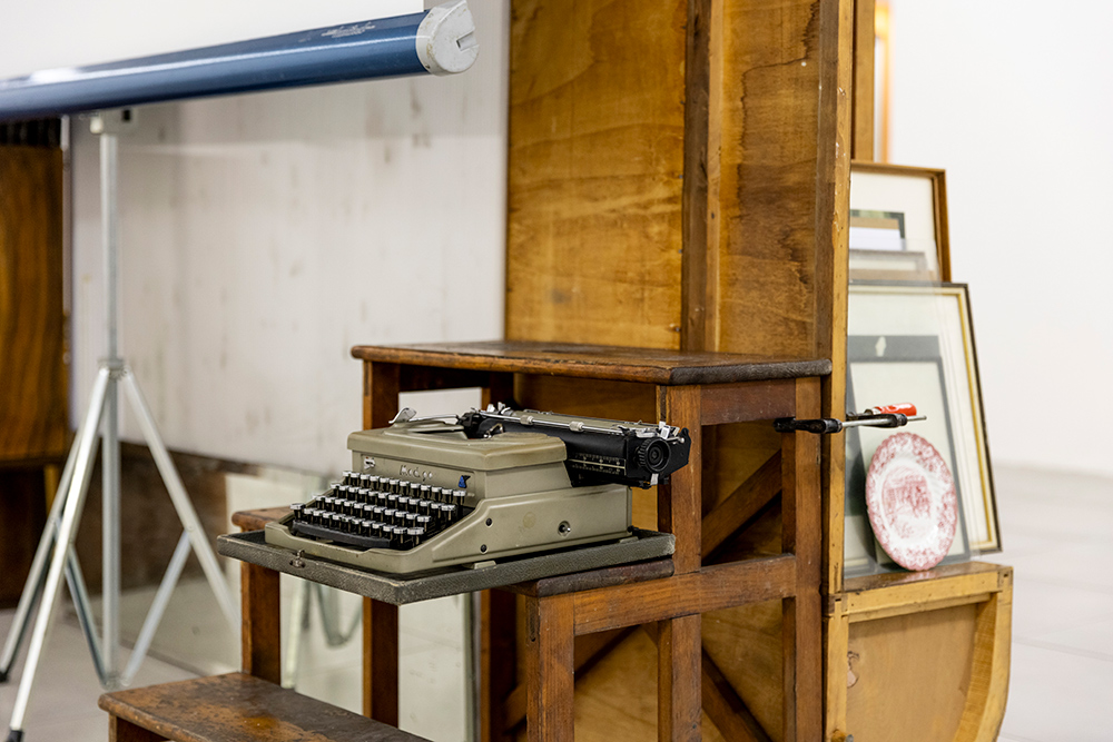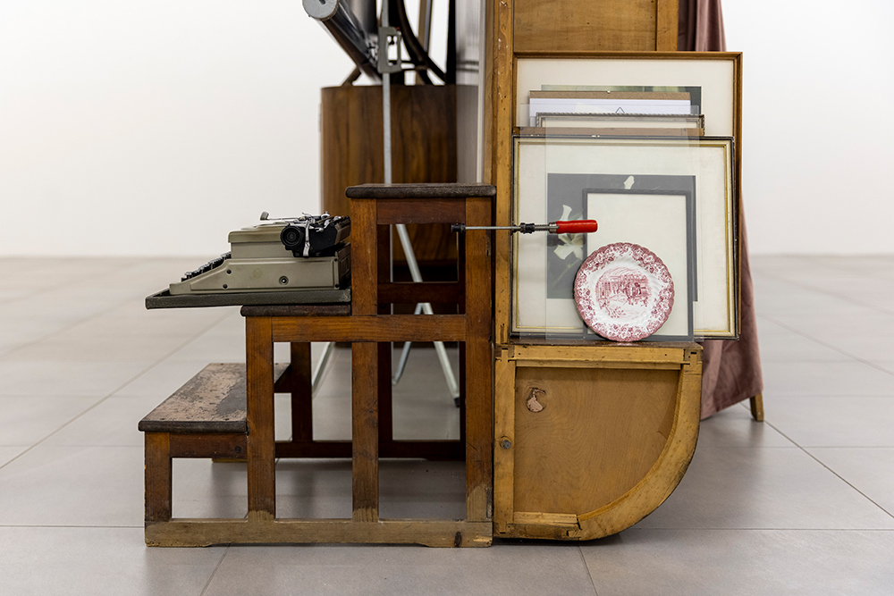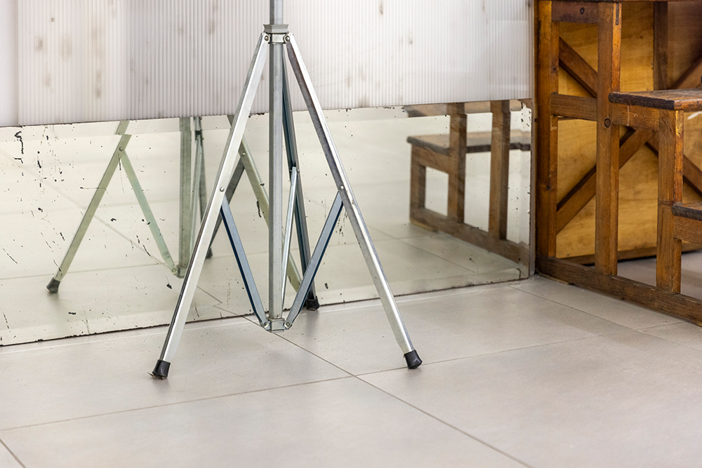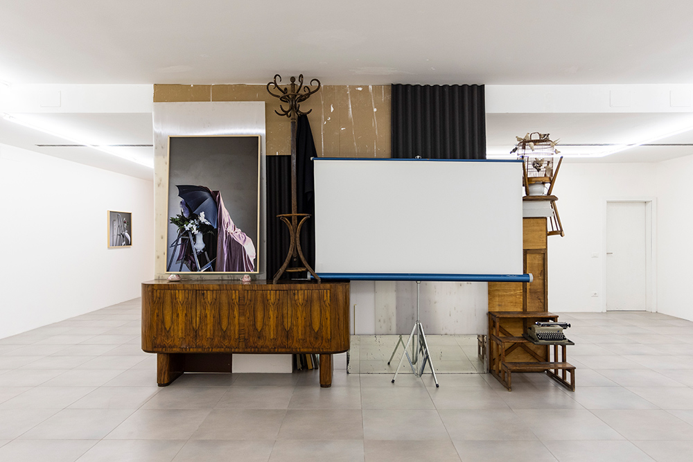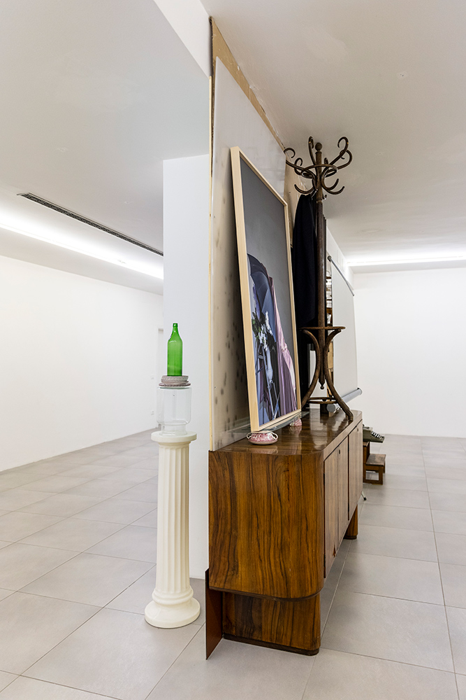 Retroscena accosta una serie di fotografie recenti in cui ricorre l’elemento dello scaleo – emblema del processo di costruzione della scena - a una nuova installazione da cui la mostra prende il titolo: un intervento site-specific realizzato con materiali trovati in loco nei magazzini di Foto Forum, resti di precedenti allestimenti e oggetti presi in prestito dallo studio di Hartmut Prünster, co-fondatore della galleria e a sua volta accumulatore di oggetti trovati. Questa passione comune per l’oggetto e per la sua storia intrinseca porta l’artista ad attingere a una collezione altrui, scegliendo gli elementi come se fossero parte del suo repertorio, intuendone un vissuto senza conoscerlo direttamente. La selezione dalla collezione di Hartmut dà così il la all’installazione, che progredisce attorno alla colonna portante dello spazio espositivo, in mezzo alla sala.