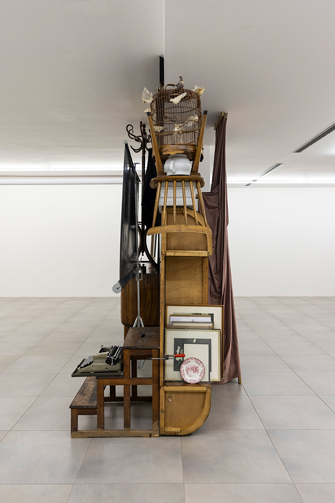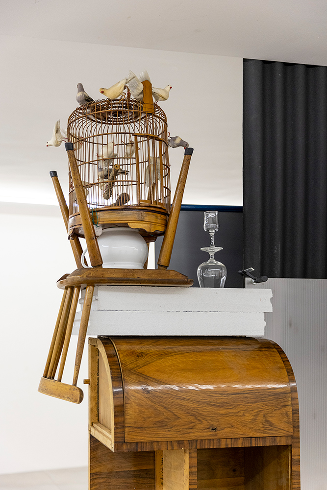 Retroscena segna uno scarto rispetto alla produzione installativa precedente, che dal 2013 si modellava sull’idea di Wunderkammer, dove frammenti del quotidiano, materia organica e inorganica, proliferano su se stessi generando un incantamento della visione inscindibile dal sentimento di un tempo che consuma, inesorabile. Qui il lavoro trova una dimensione scultorea nuova, assecondando una tensione opposta a quel moto centrifugo che nelle “camere delle meraviglie” frastagliava e moltiplicava la visione. Gli oggetti sono come tenuti insieme da una forza centripeta e paratattica, che li riporta sulla ribalta dell’esistenza.
