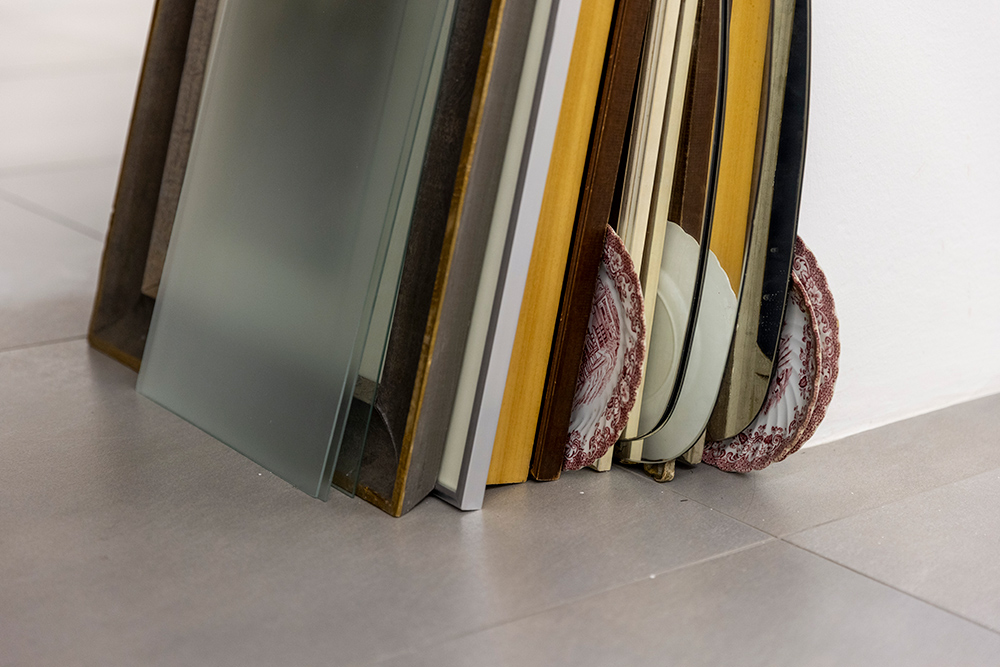 Dal piano orizzontale della natura morta, da cui ha origine la produzione fotografica di Bettazzi, la composizione si sviluppa adesso su piani verticali, dove gli oggetti si dispongono e si incastonano. Sono pareti provvisorie, quinte che dividono lo spazio e lo articolano in una scena bifronte in cui è l’oggetto a farsi materia scultorea, costruendo volumi e aperture, assonanze cromatiche e accostamenti inattesi, che talvolta costruiscono immagini riconducibili alla storia del luogo: cornici e i vetri accatastati, una fotografia della catena montuosa del Catinaccio, uno schermo avvolgibile per proiezioni. Come un archivio della memoria, l’installazione si apre a processi di scavo e ri-figurazione1: una superficie materiale che innesca uno sguardo retrospettivo capace però di proiettarsi in avanti, ridisegnando trame narrative e relazioni temporali, mentre l’oggetto, sottratto all’oblio, riscatta una accettazione implicita del passaggio del tempo.