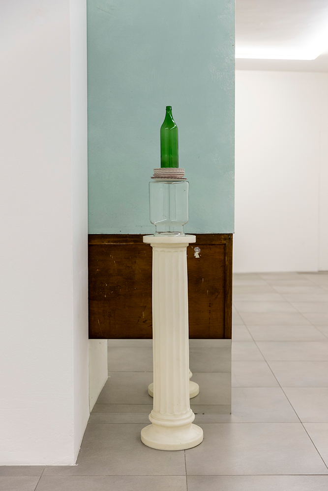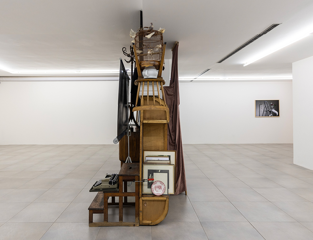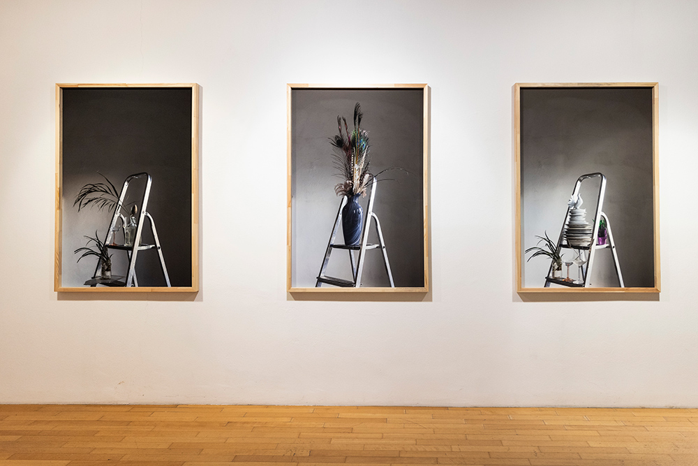 Scendendo al piano interrato della Galleria si entra di fatto in una dimensione teatrale, ed è solo muovendosi nello spazio che il potere evocativo dell’oggetto decontestualizzato si lascia percepire, girando attorno ad una scena in cui recto e verso coesistono pur modellando paesaggi diversi ma reversibili. Prima di accedere a questo luogo metafisico in cui fotografia, scultura e installazione diventano un unico ambiente, prima ancora di osservare gli Equilibri precari e le torri di oggetti nelle fotografie degli scalei, c’è un fuoriscena (nella vetrina che affaccia sulla strada) che rimanda alle prime composizioni oggettuali dell’artista. Un omaggio alla poesia silenziosa delle nature morte di Giorgio Morandi e insieme una citazione dei filtri frapposti tra soggetto e obiettivo nelle immagini di Luigi Ghirri, che nel momento in cui svelano l’artificio restituiscono mistero e densità alla materia del quotidiano.