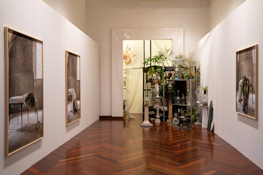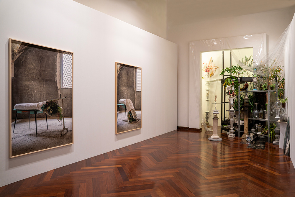 Attraverso la fotografia e l’installazione ambientale Chiara Bettazzi indaga l’idea di trasformazione in relazione al paesaggio industriale e all’elemento vegetale. Sin dagli esordi la sua ricerca è legata a una riflessione sull’accumulo di oggetti d’uso quotidiano e il loro riutilizzo in composizioni che evocano presenze animate. Nei ritratti fotografici di Palazzo Braschi a prendere vita sono oggetti domestici assemblati a elementi vegetali: un materasso avvolto da panneggi e lenzuola, una stampella, l’anta di un armadio, un supporto ligneo e un tavolino da cucina sostengono una composizione di fiori finti che si affaccia da una delle estremità. L’artista mette in scena la metamorfosi degli elementi fotografati in diverse pose nel cantiere dell’ex convento di Sant’Orsola a Firenze: ad animare queste figure dal carattere fantasmatico è la progressione sequenziale degli scatti. La successione di immagini testimonia l’azione quasi performativa dell’artista che ne compone e scompone le parti, mantenendosi dietro le quinte, esclusa dallo sguardo. A metà fra nature morte e deposizioni, questi assemblaggi suggeriscono uno stato di permanente dinamismo del soggetto legato all’evoluzione degli accadimenti naturali. L’installazione ambientale che accompagna le fotografie vive invece di una precarietà costitutiva, strettamente legata alla temporalità della mostra: è attraverso l’ibridazione di materiali organici e inorganici che la composizione prende forma, in direzione di un equilibrio caotico in cui ogni elemento trova la sua collocazione naturale.